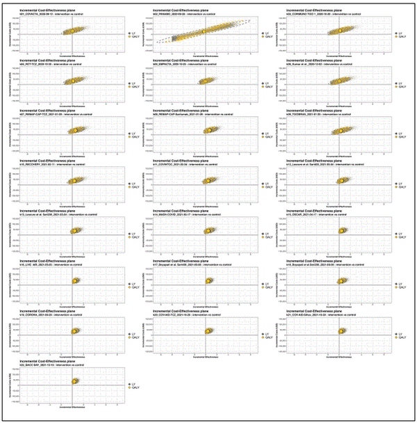 All other model parameters were based on best available evidence as of December 2021. An overview of these parameters is provided in the supplementary materials (Supplementary File: Excel). We applied the cost and length of stay of tocilizumab as the most frequently used drug in the meta-analysis as the cost of treatment. Our analysis was conducted from the US health-system perspective with a $100,000/quality-adjusted life-year (QALY) willingness-to-pay (WTP) threshold with a lifetime horizon. Costs were estimated in 2020 US dollars ($). We applied a 3% annual discount rate for both costs and effects, and probabilistic analysis was performed with 10,000 iterations.