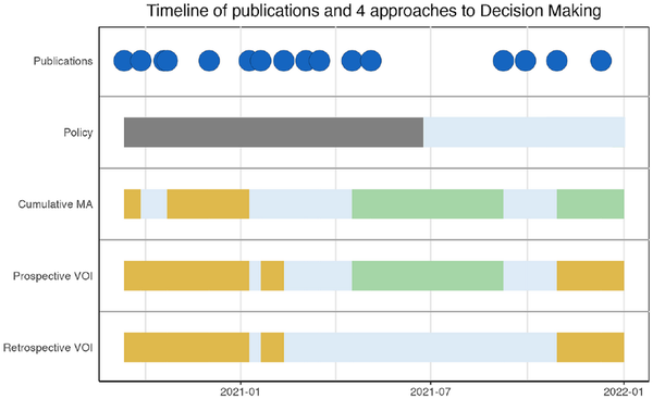 Our article calculates EVs of new decisions made immediately when new evidence becomes available. However, decision making and implementation take time and resources. Our analysis does not consider the cost to conduct CMA or VOI analyses themselves. Although our conclusion states that the policy approach did not make the appropriate decisions and delayed EUA, we do not consider the time frame it would take to act on VOI recommendations or the time required to develop a working decision analytic model. The first COVID-19 VOI model preprint became available only March 2022, beyond the scope of this timeline. By providing our full code, collected data, and this framework, we hope that analyses performed in future crisis situations can build on this existing work and enable more rapid decision making.