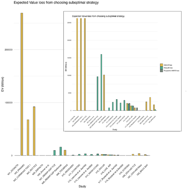 Finally, we calculated the loss in EV for each of the possible approaches. We calculated the expected loss of the strategies proposed by each approach (policy, CMA, or prospective VOI) by comparing their EVs to the EVs of the retrospective VOI (i.e., reference standard). For example, if CMA suggests AWR as the optimal strategy and retrospective VOI suggests approve, then we calculate the net value of the retrospective VOI EV for approve minus the retrospective VOI EV for AWR.