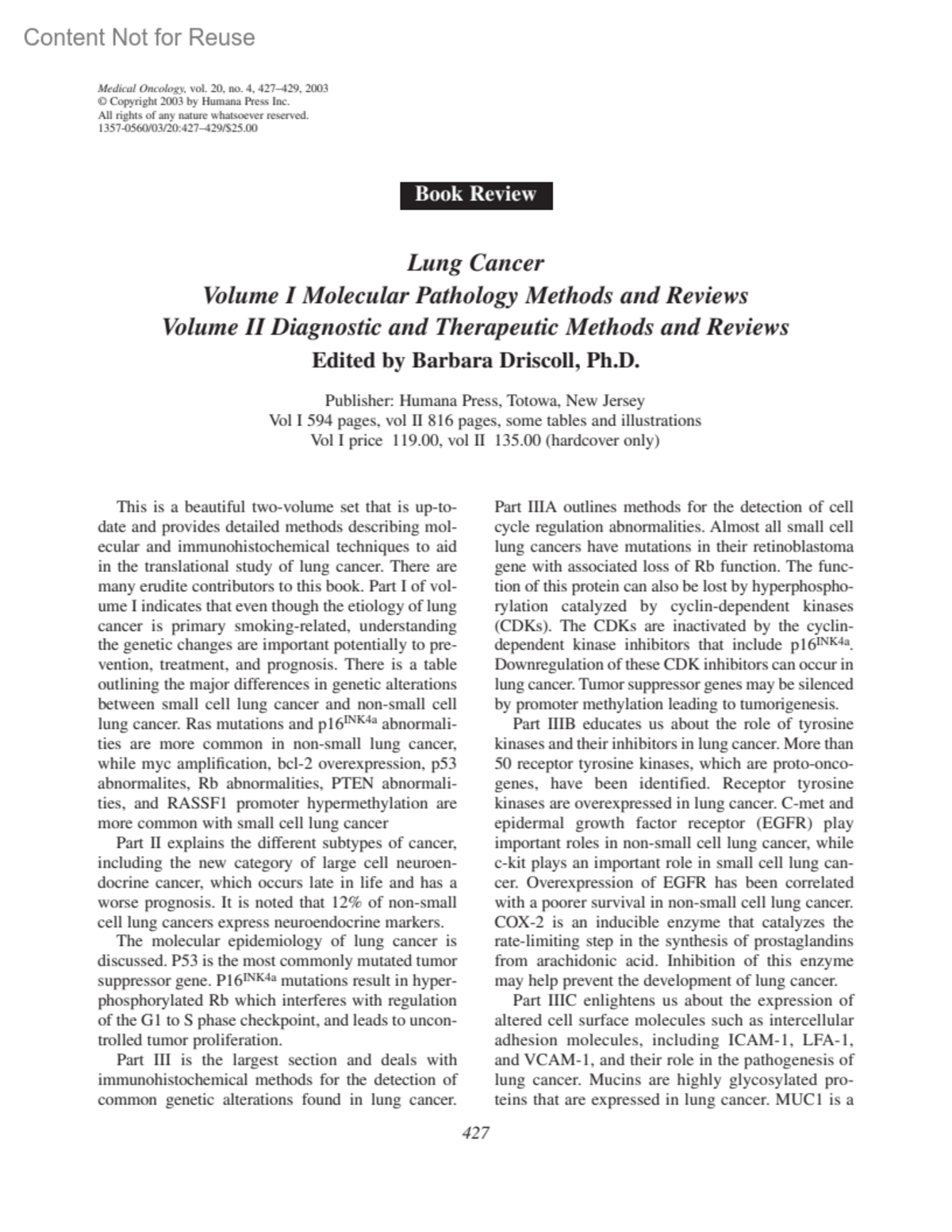 Lung Cancer Volume I Molecular Pathology Methods and Reviews Volume II Diagnostic and Therapeutic Methods and Reviews Edited by Barbara Driscoll, Ph.D.