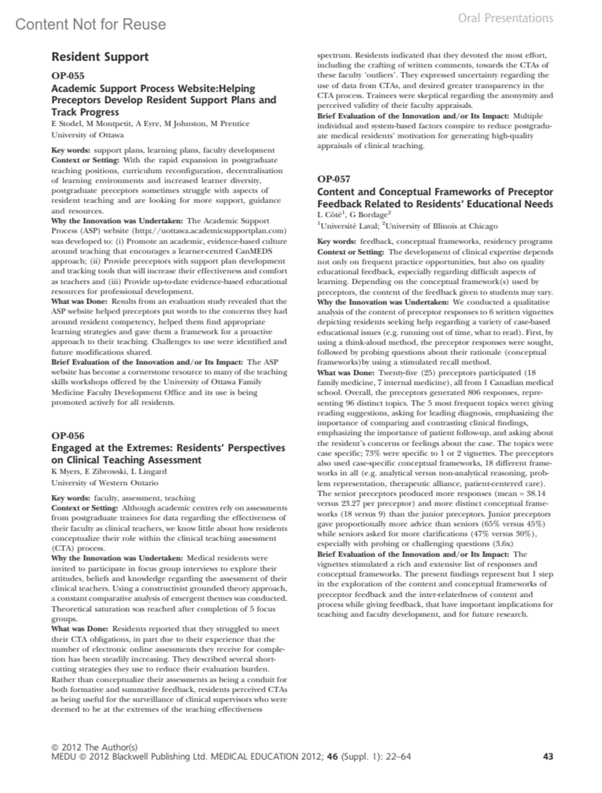 Engaged at the Extremes: Residents’ Perspectives on Clinical Teaching AssessmentOP-056Myers, KZibrowski, ELingard, LAuthor informationUniversity of Western OntarioMedical Education 46:p 43, May 2012.Copyright © 2012 Blackwell Publishing Ltd.