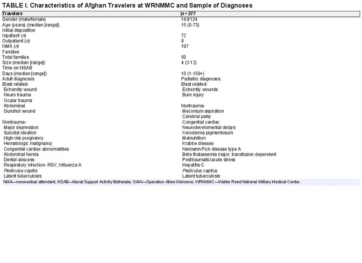 After two decades of war in Afghanistan, on July 14, 2021, the White House announced Operation Allies Refuge (OAR), to support Special Immigrant Visas for eligible Afghan nationals and their families who supported the U.S. Government (https://www.northcom.mil/OAR/ accessed on November 9, 2021). On August 26, 2021, a suicide bombing at the Hamid Karzai International Airport in Kabul, Afghanistan, killed at least 183 people, prompting emergent medical evacuation to the United States via Landstuhl Regional Medical Center (LRMC) in addition to the ongoing airlift efforts to designated immigration processing centers, known as “safe havens.” Walter Reed National Military Medical Center (WRNMMC) was alerted on August 27, 2021, to prepare to receive up to 63 injured patients in 48-96 hours. Following the initial medical evacuations, more travelers continued to arrive over the following months in support of Operation Allies Welcome (OAW) (https://www.dhs.gov/allieswelcome accessed on November 9, 2021).
