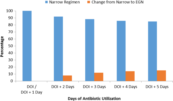 Thirty-two patients (15% of 212) had their prophylactic regimen changed to include EGN coverage after receiving a narrow regimen for at least 48 h (day of injury plus day after injury) (Fig. 1). The majority of patients (17; 53% of 32) had the change occur 1 d after the start of the narrow regimen with small increments of patients continuing to transition to EGN coverage as time following the initiation of the narrow regimen progressed.