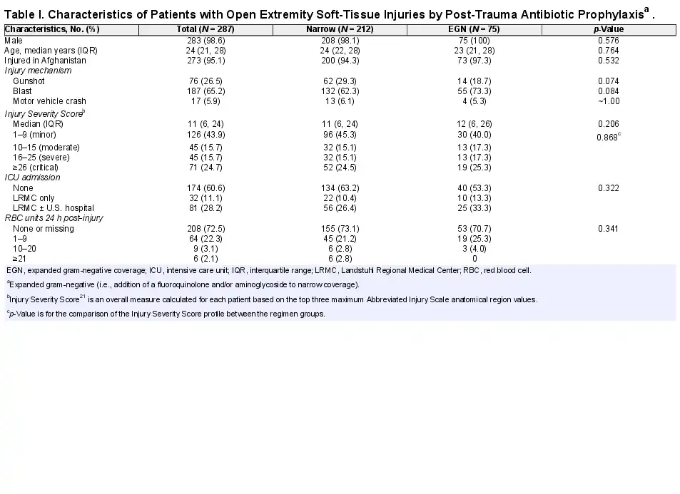 Among the 287 trauma patients, 212 (74%) and 75 (26%) received narrow and EGN post-trauma antibiotic prophylaxis, respectively (p < 0.001). There was no significant difference between the patients who received the narrow regimen and EGN coverage regarding injury severity, mechanism of injury, transfusion requirements, and admission to the intensive care unit (Table 1). Nonetheless, there appeared to be a non-significant trend towards EGN patients being less likely to have gunshot wounds and more likely to have blast as their mechanism of injury.