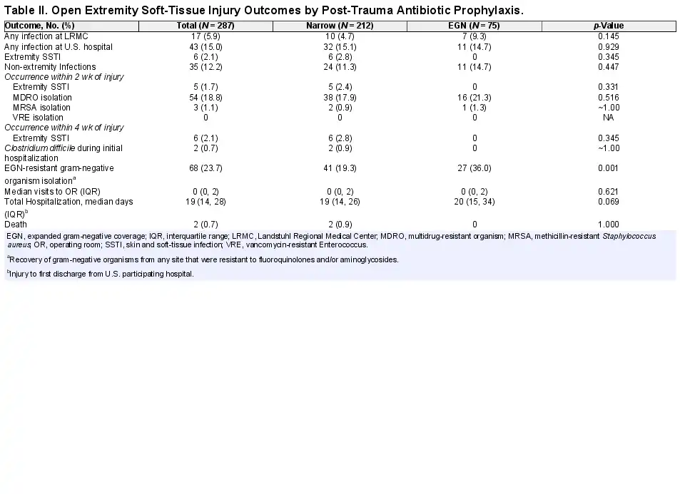 In summary, our findings provide evidence that the addition of EGN antibiotics to post-traumatic combat-related soft-tissue injuries does not improve infectious outcomes. Importantly, neither the guidelines nor this study should deter clinicians from using their clinical judgment and individualizing care.
