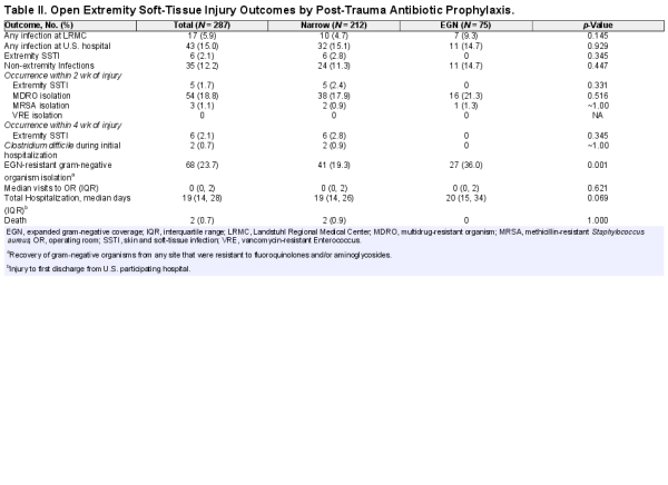 There was no significant difference in the number of operating room visits (75% of both groups had less than two visits) or duration of hospitalization (median of 20 versus 19 d) between the patients who received EGN coverage and a narrow regimen, respectively (Table 2). There was also no difference in mortality between the two groups, and the deaths that occurred were in very severely injured soldiers and not the result of a SSTI.