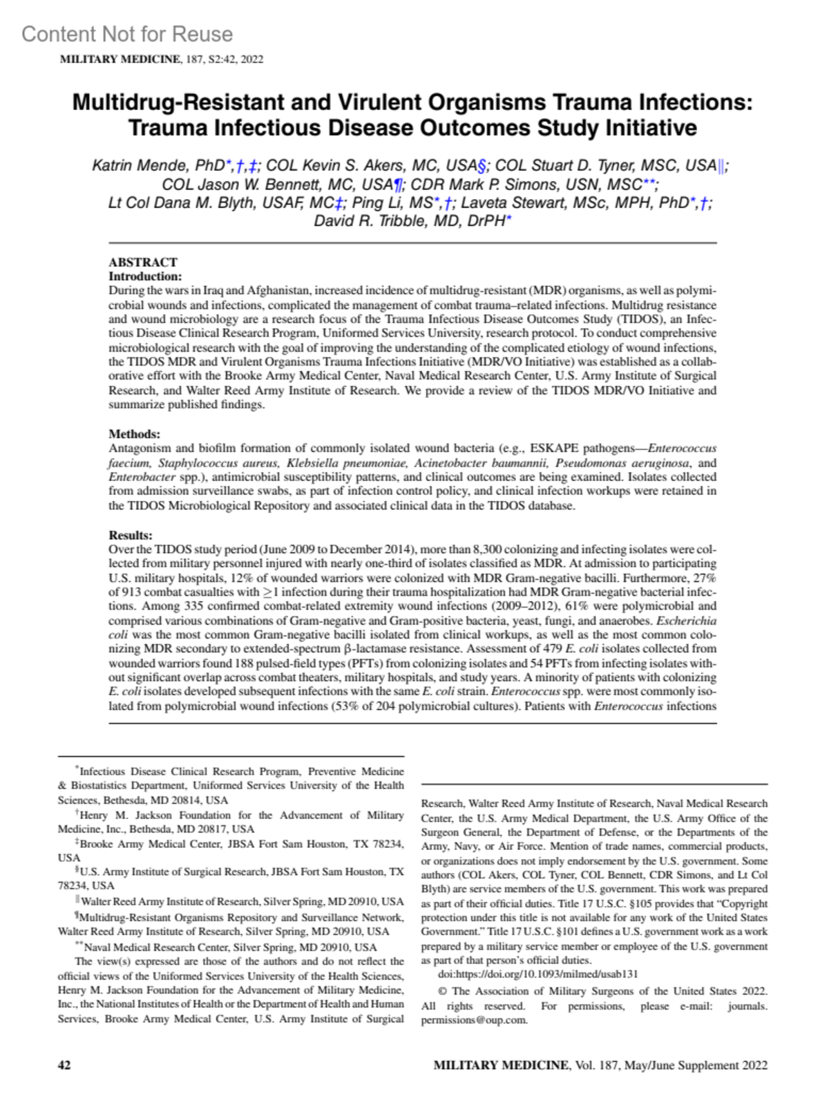 The view(s) expressed are those of the authors and do not reflect the official views of the Uniformed Services University of the Health Sciences, Henry M. Jackson Foundation for the Advancement of Military Medicine, Inc., the National Institutes of Health or the Department of Health and Human Services, Brooke Army Medical Center, U.S. Army Institute of Surgical Research, Walter Reed Army Institute of Research, Naval Medical Research Center, the U.S. Army Medical Department, the U.S. Army Office of the Surgeon General, the Department of Defense, or the Departments of the Army, Navy, or Air Force. Mention of trade names, commercial products, or organizations does not imply endorsement by the U.S. government. Some authors (COL Akers, COL Tyner, COL Bennett, CDR Simons, and Lt Col Blyth) are service members of the U.S. government. This work was prepared as part of their official duties. Title 17 U.S.C. §105 provides that “Copyright protection under this title is not available for any work of the United States Government.” Title 17 U.S.C. §101 defines a U.S. government work as a work prepared by a military service member or employee of the U.S. government as part of that person’s official duties.