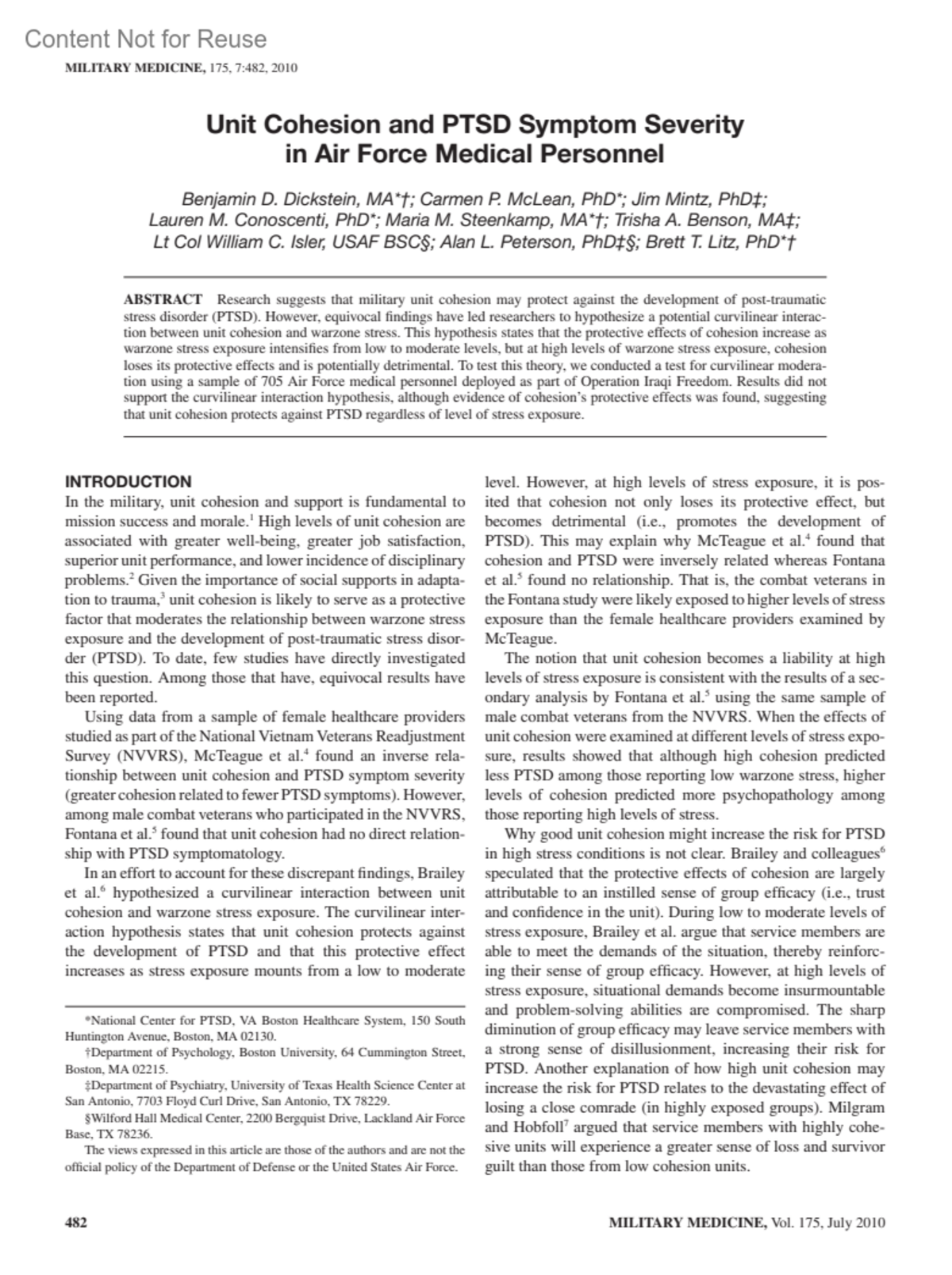 Unit Cohesion and PTSD Symptom Severity in Air Force Medical Personnel