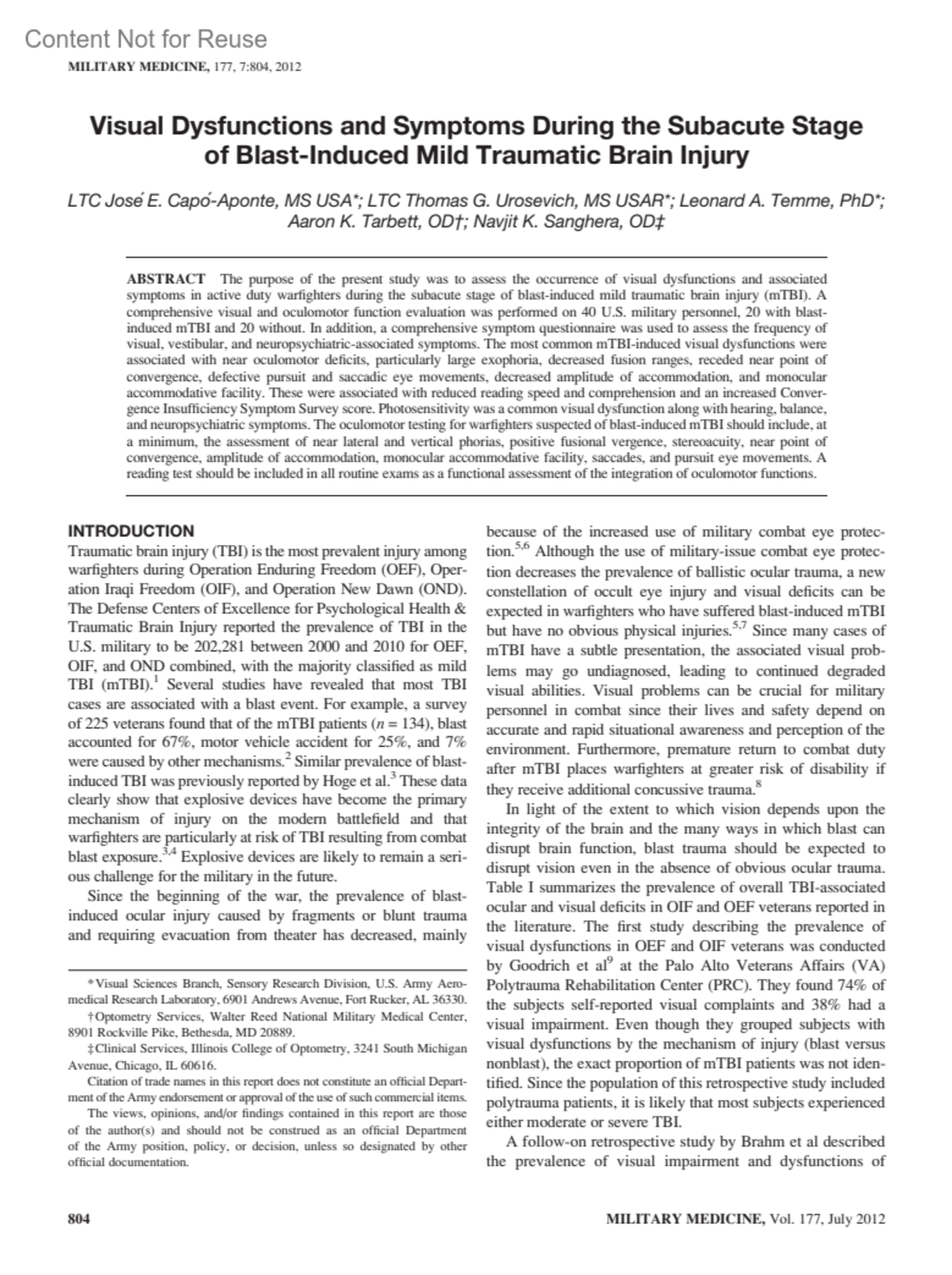 Visual Dysfunctions and Symptoms During the Subacute Stage of Blast-Induced Mild Traumatic Brain Injury