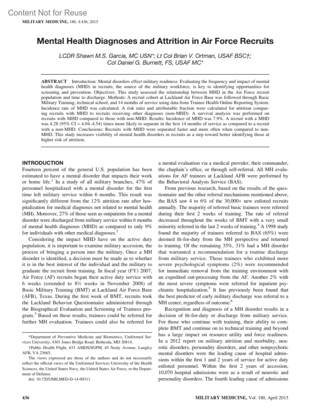 Mental Health Diagnoses and Attrition in Air Force Recruits