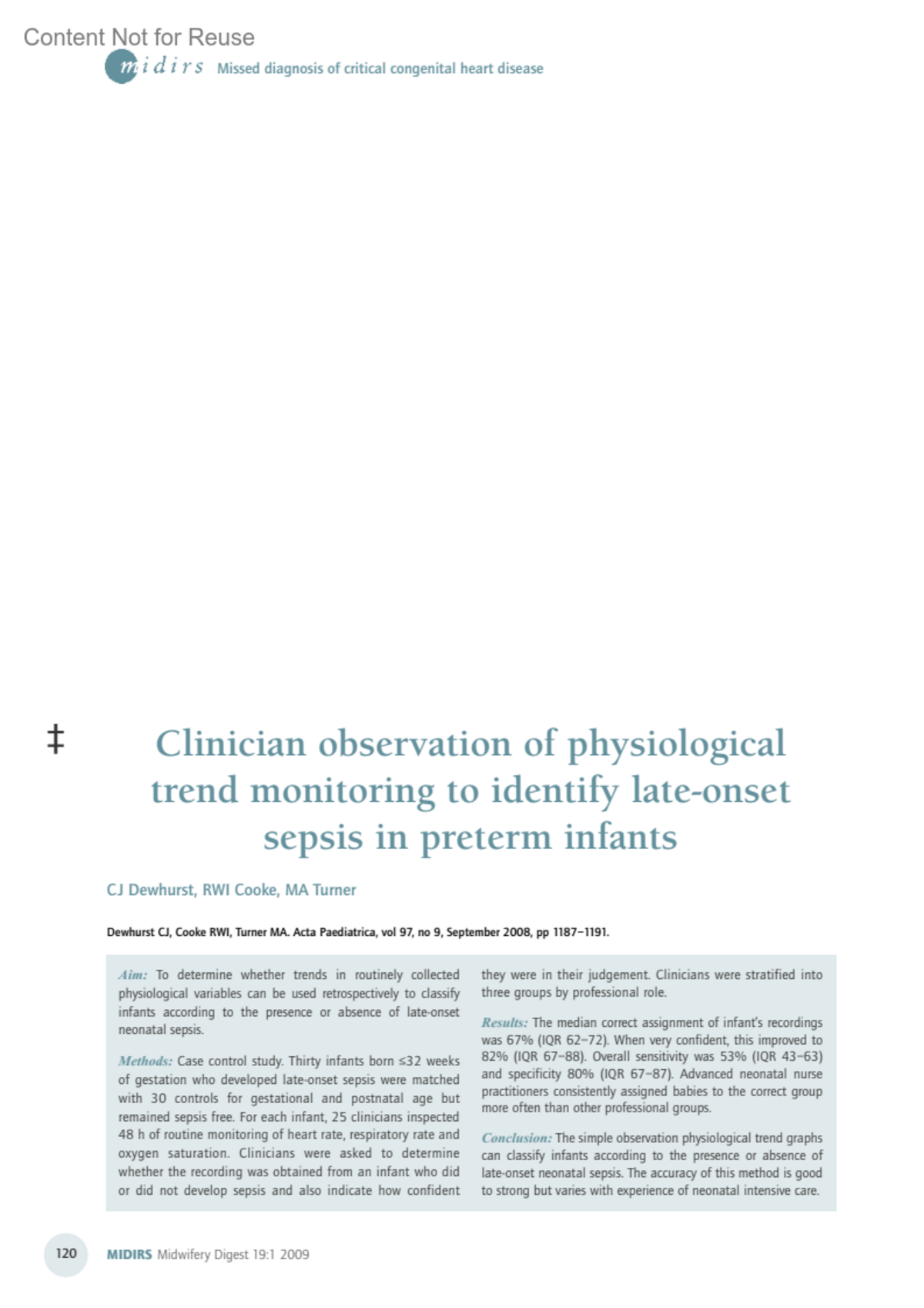 ‡ Clinician observation of physiological trend monitoring to identify late-onset sepsis in preterm infants