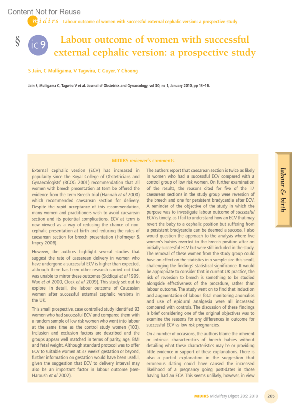 § ic9 Labour outcome of women with successful external cephalic versiona prospective studyJain, SMulligama, CTagwira, VGuyer, CChoeng, YMIDIRS Midwifery Digest 20(2):p 205-206, June 2010.Copyright ©2010 MIDIRS