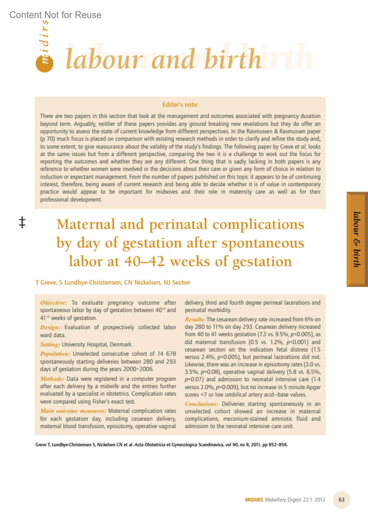 Greve T, Lundbye-Christensen S, Nickelsen CN et al. Acta Obstetricia et Gynecologica Scandinavica, vol 90, no 8, 2011, pp 852-856.