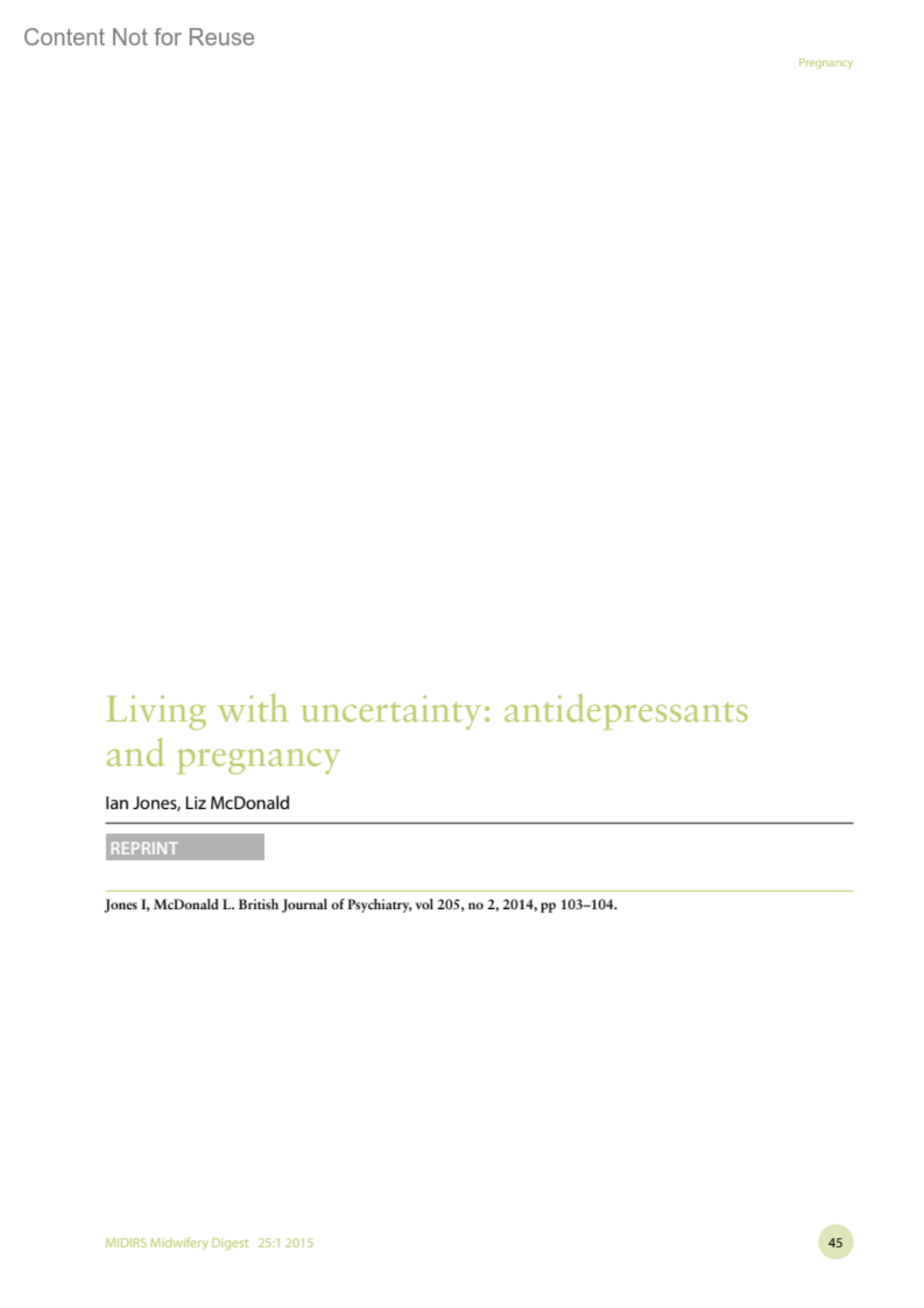 Living with uncertainty: antidepressants and pregnancyJones, IanMcDonald, LizMIDIRS Midwifery Digest 25(1):p 45, May 2015.Copyright ©2015 MIDIRS