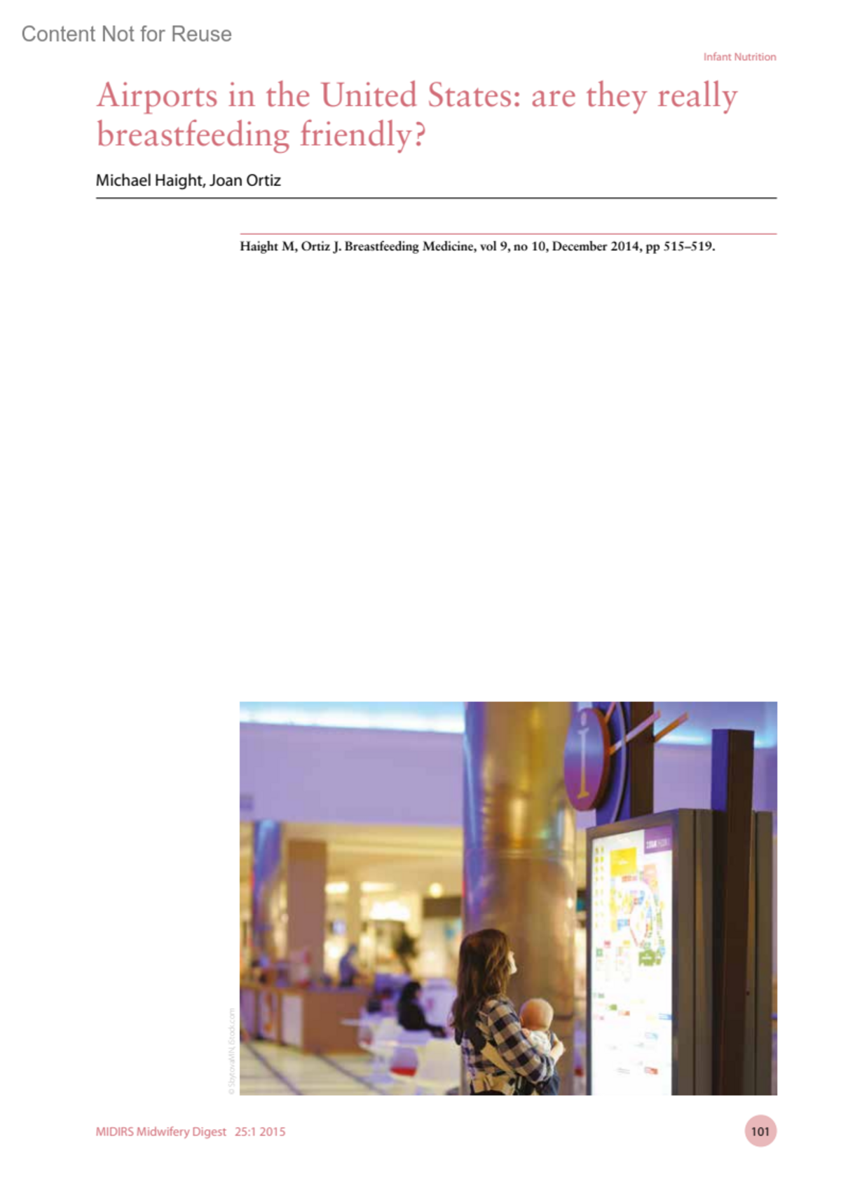 Airports in the United States: are they really breastfeeding friendly?Haight, MichaelOrtiz, JoanMIDIRS Midwifery Digest 25(1):p 101, May 2015.Copyright ©2015 MIDIRS