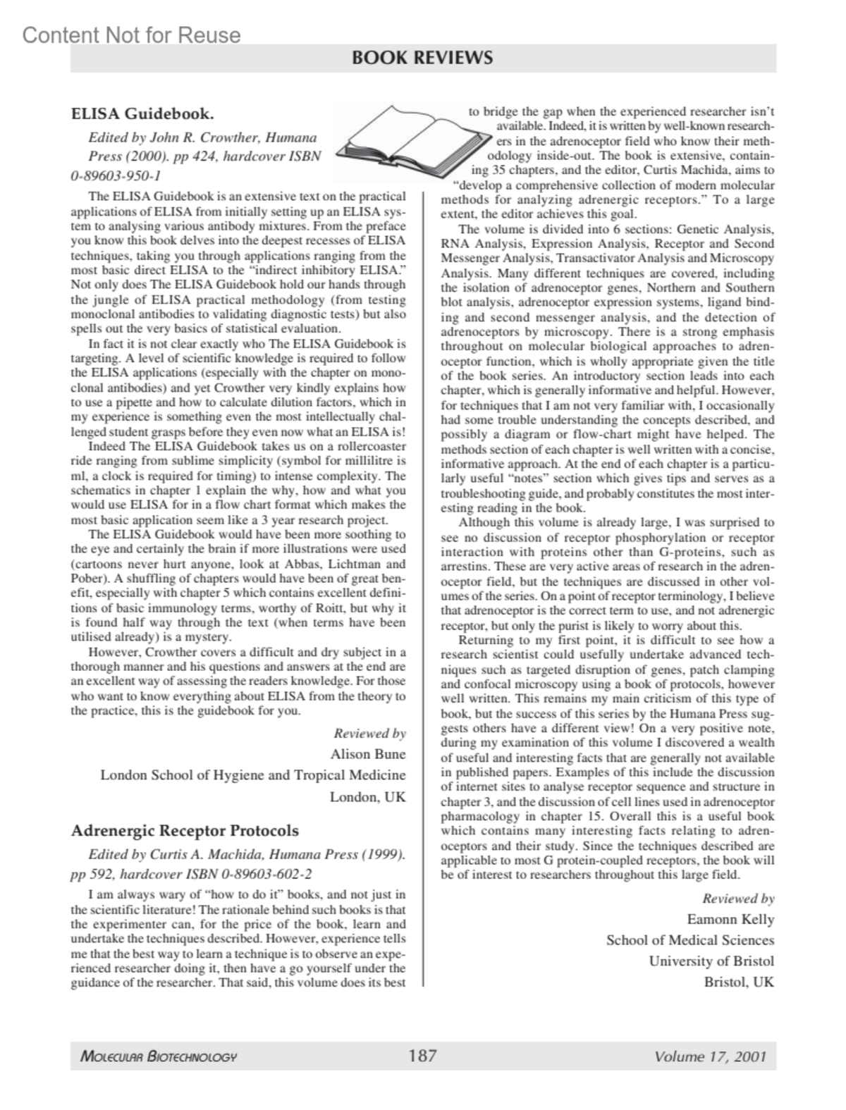 ELISA GuidebookEdited by John R. Crowther, Humana Press (2000). pp 424, hardcover ISBN 0-89603-950-1Bune, Reviewed by AlisonAuthor informationLondon School of Hygiene and Tropical Medicine London, UKMolecular Biotechnology 17(2):p 187, 2001.Copyright © 2001 Humana Press