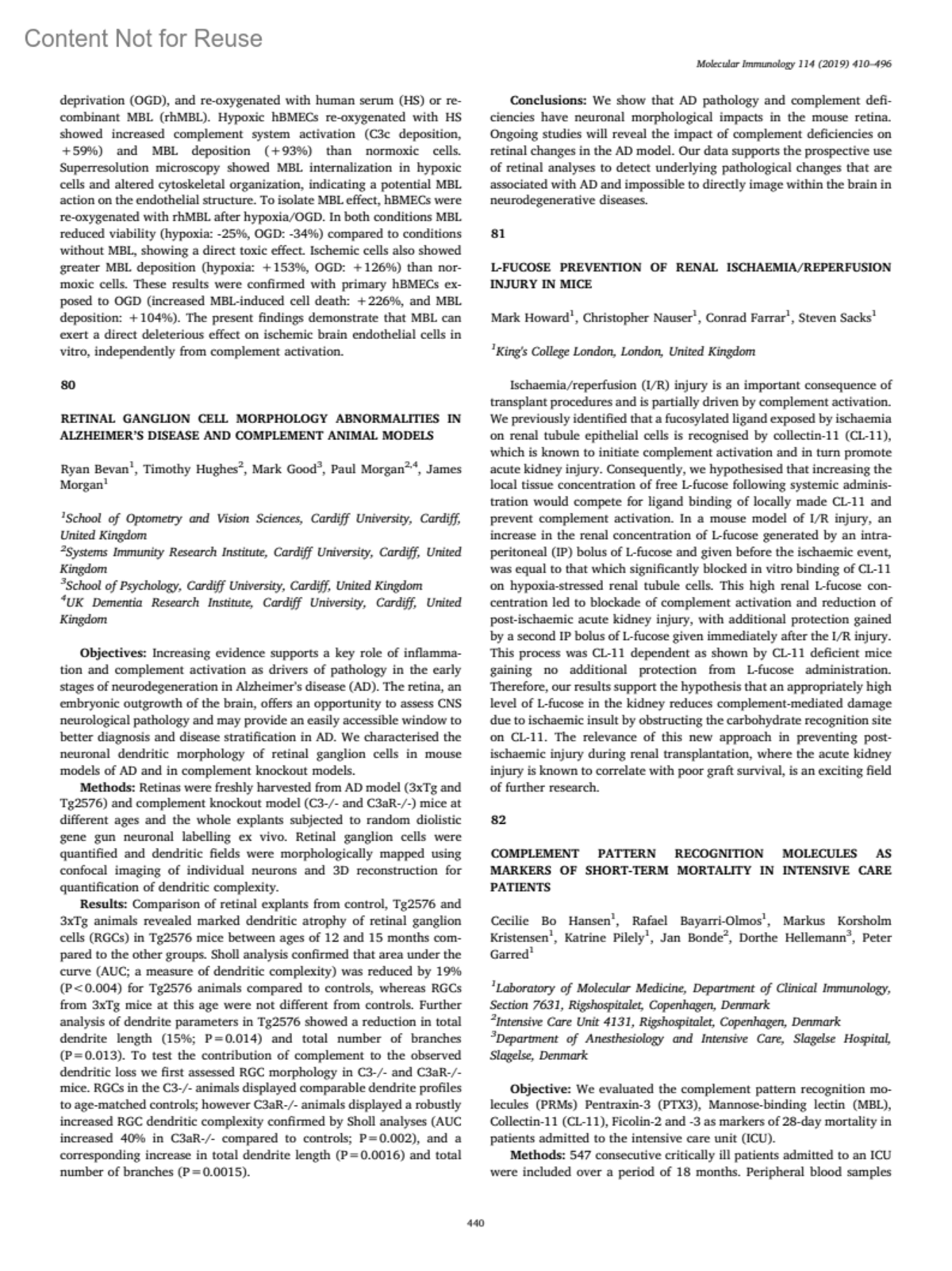 L-FUCOSE PREVENTION OF RENAL ISCHAEMIA/REPERFUSION INJURY IN MICE81Howard, MarkNauser, ChristopherFarrar, ConradSacks, StevenAuthor information1King’s College London, London, United KingdomMolecular Immunology 114:p 440, October 2019.Copyright © 2019Elsevier, Inc.