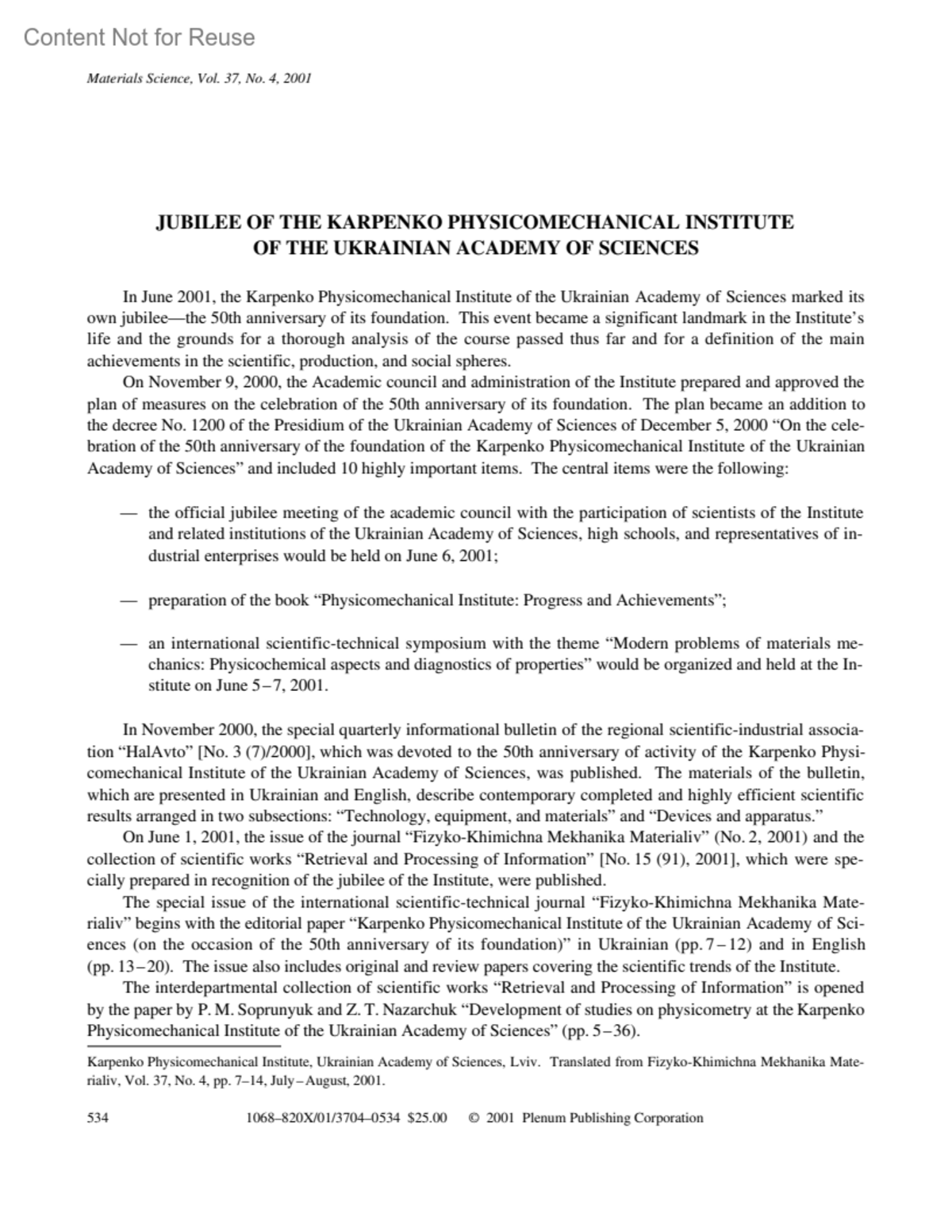 JUBILEE OF THE KARPENKO PHYSICOMECHANICAL INSTITUTE OF THE UKRAINIAN ACADEMY OF SCIENCESMarynets, V. P.Author informationScientific Secretary of the Karpenko Physicomechanical Institute of the Ukrainian Academy of SciencesMaterials Science 37(4):p 534-543, July-August 2001.Copyright ©2001 Kluwer Academic Publishers