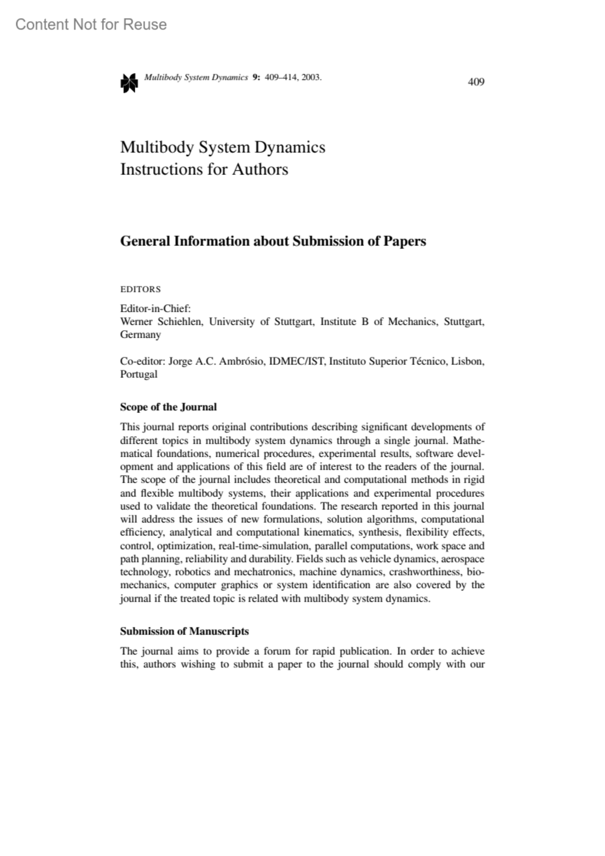 Instructions for AuthorsGeneral Information about Submission of PapersAmbrósio, Jorge A.C.Author informationIDMEC/IST Instituto Superior Técnico Av. Rovisco Pais 1 1049-001 Lisbon PortugalMultibody System Dynamics 9(4):p 409-414, May 2003.Copyright ©2003 Kluwer Academic Publishers