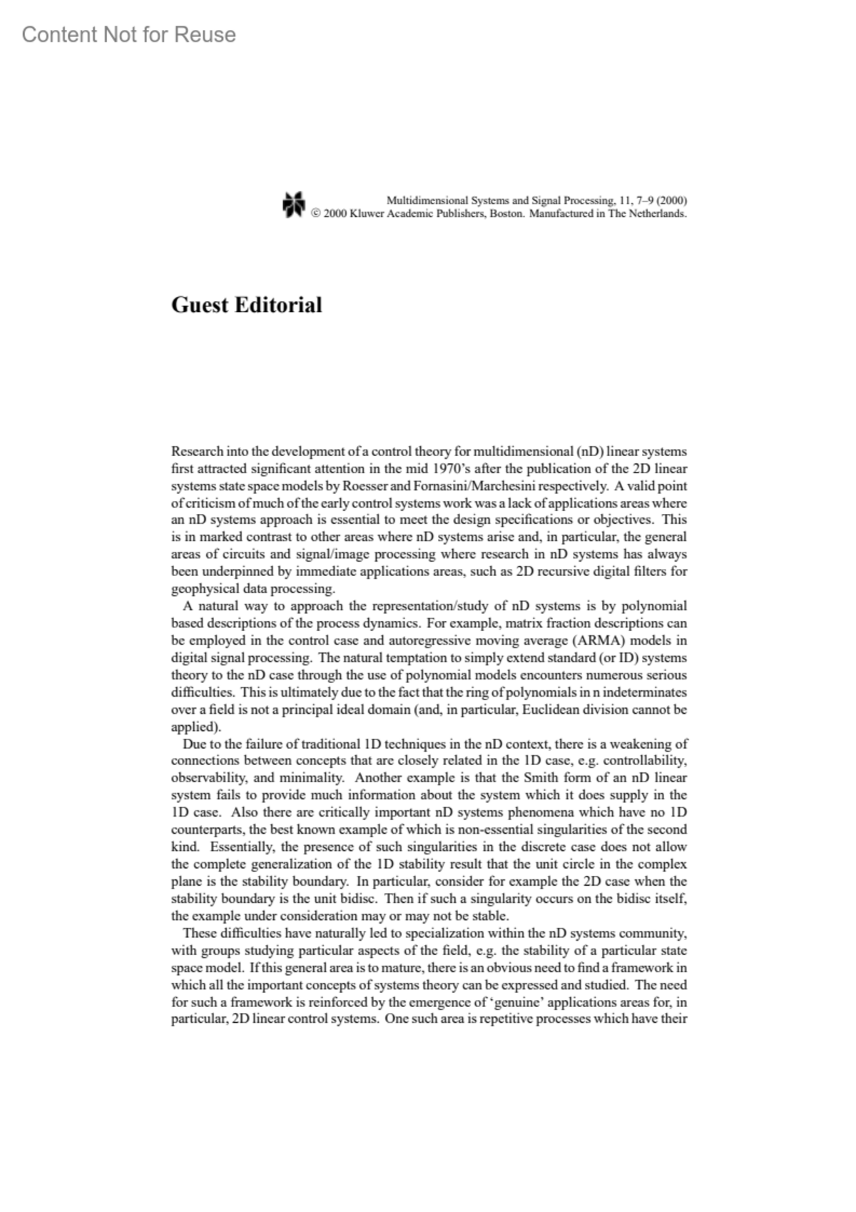 Guest EditorialMultidimensional Systems & Signal Processing 11(2):p 7-9, April 2000.Copyright ©2000 Kluwer Academic Publishers