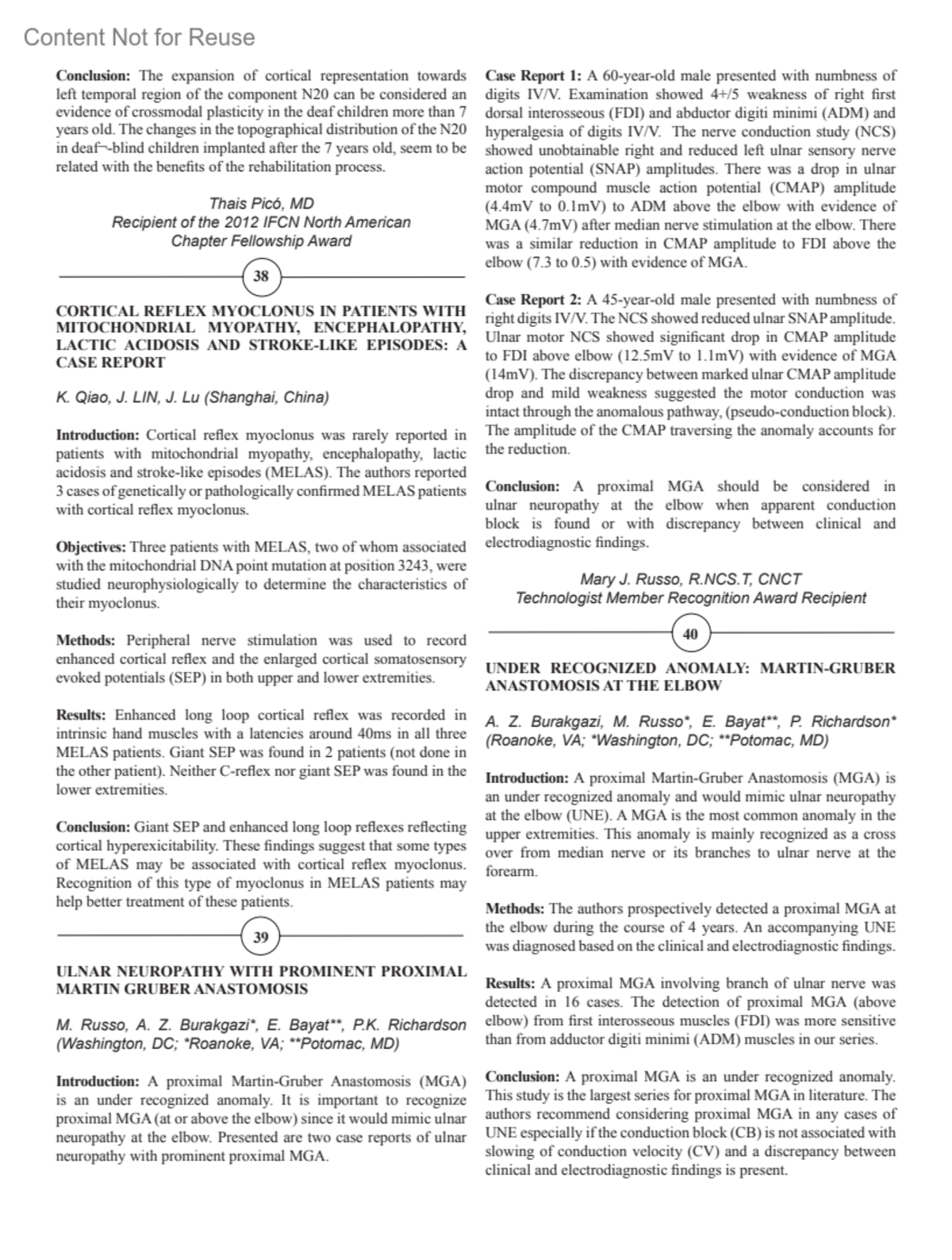 ULNAR NEUROPATHY WITH PROMINENT PROXIMAL MARTIN GRUBER ANASTOMOSIS39Russo, M.Burakgazi, A. Z.Bayat, E.Richardson, P. K.Author informationWashington, DC;*Roanoke, VA;**Potomac, MDMary J. Russo, R.NCS.T, CNCT Technologist Member Recognition Award RecipientMuscle & Nerve 46(4):p 634, October 2012.Copyright © 2012 John Wiley & Sons, Inc.