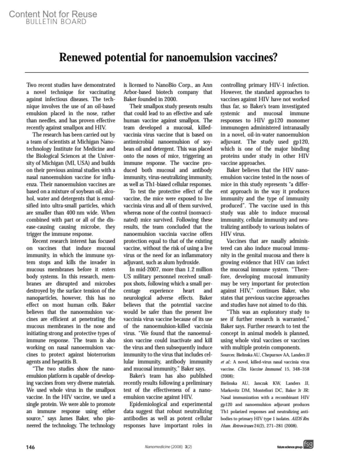 Renewed potential for nanoemulsion vaccines?Nanomedicine 3(2):p 146, April 2008.Copyright © 2008Future Medicine, Ltd.