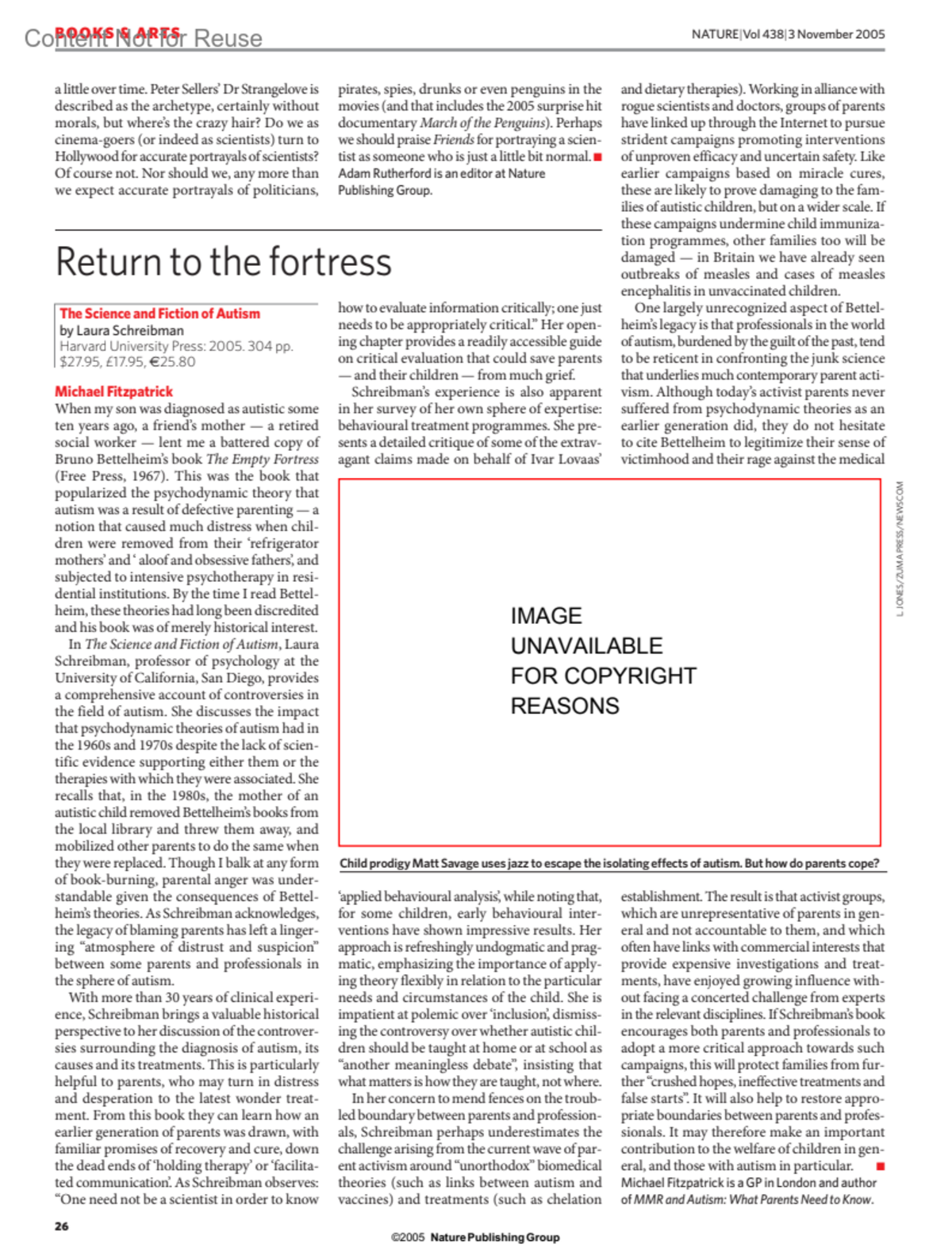 The Science and Fiction of AutismFitzpatrick, MichaelAuthor informationMichael Fitzpatrick is a GP in London and author of MMR and Autism: What Parents Need to Know.Nature 438(7064):p 26, November 3, 2005.Copyright © 2005 Nature Publishing Group