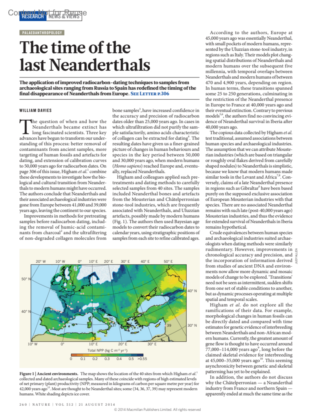 The application of improved radiocarbon-dating techniques to samples from archaeological sites ranging from Russia to Spain has redefined the timing of the final disappearance of Neanderthals from Europe. See Letter p.306