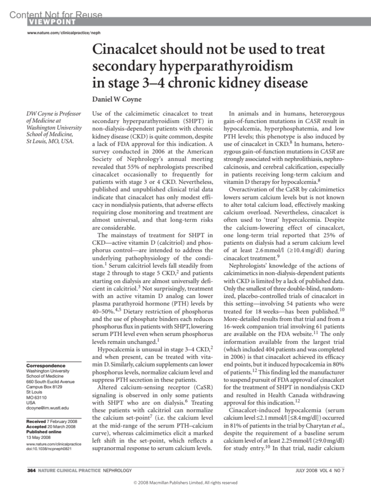 In the first of two opposing Viewpoints, Daniel W Coyne questions the use of cinacalcet to treat secondary hyperparathyroidism in non-dialysis-dependent patients with chronic kidney disease. He highlights the absence of FDA approval and the lack of published data for cinacalcet in this setting. Cinacalcet does not, he argues, address a universal pathophysiologic feature of secondary hyperparathyroidism; in addition, it has considerable adverse effects.