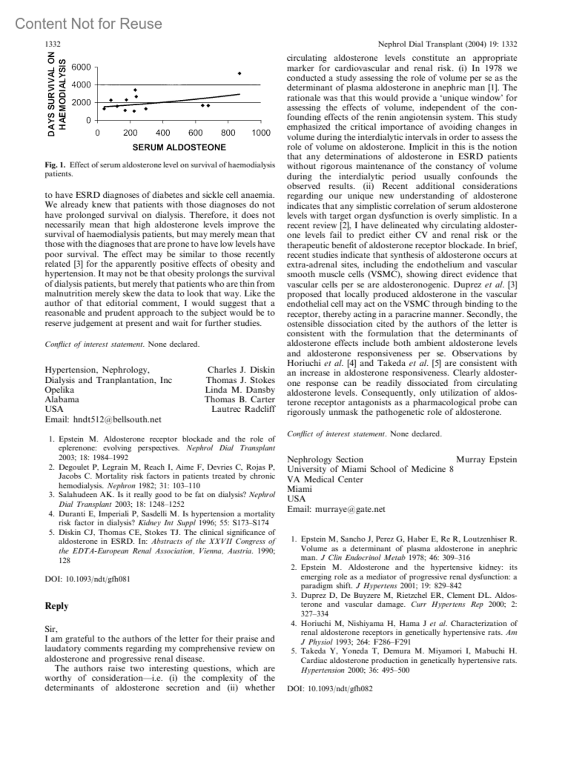 The clinical significance of aldosterone in ESRD: Part IIEpstein, MurrayAuthor informationNephrology Section, University of Miami School of Medicine, 8 VA Medical Center, Miami, USA. Email: [email protected]Nephrology Dialysis Transplantation 19(5):p 1332, May 2004.Copyright © Copyright Oxford University Press 2004.
