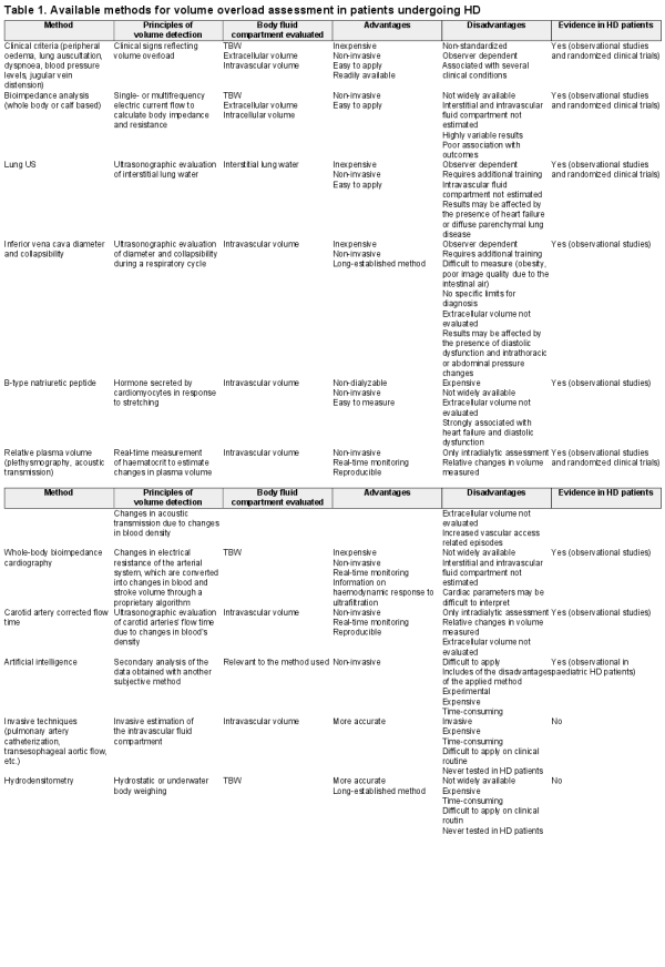 Defining the optimal hydration status in HD patients is challenging and the identification of an accurate and objective method to evaluate dry weight has been a focus of HD research for decades []. Most studies in this research area are observational in nature and there is a paucity of trials testing diagnostic methods that may guide treatment of volume overload and improve outcomes in these patients. Moreover, the Kidney Disease Outcomes Quality Initiative HD guidelines do not include recommendations for the diagnosis of fluid overload by objective methods []. The aim of this review is to summarize current knowledge regarding the associated factors, consequences, diagnosis and management of volume overload in HD.