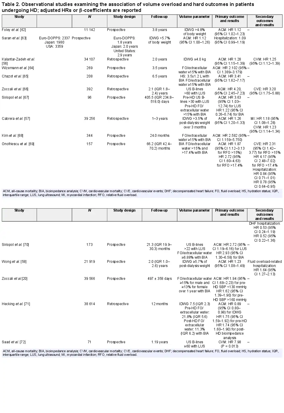 Several studies have associated objectively measured fluid overload with adverse clinical outcomes (Table 2). As analysed above, a study including ∼40 000 incident HD patients showed that cumulative 1-year fluid overload by whole-body bioimpedance spectroscopy associates with all-cause mortality, regardless of BP levels []. The hypothesis that bioimpedance-guided fluid removal might translate into better clinical outcomes is supported by a small trial (131 HD patients) with a very limited number of events (one death in the intervention and nine deaths in the control arm) []. Another randomized trial in 298 haemodialysis patients in Taiwan testing the same intervention showed that bioimpedance-guided ultrafiltration did not influence the risk of hospitalization but reduced the incidence of acute fluid overload and cardiovascular events, as well as the incidence of hypertension and intradialysis hypotension, while mortality did not differ in the two study arms, but the number of deaths was again very small again (three in the intervention arm and three in the control arm) []. Even though these trials showed signals of benefit of bioimpedance-guided treatment strategies, no conclusion can be drawn from the data gathered until now.