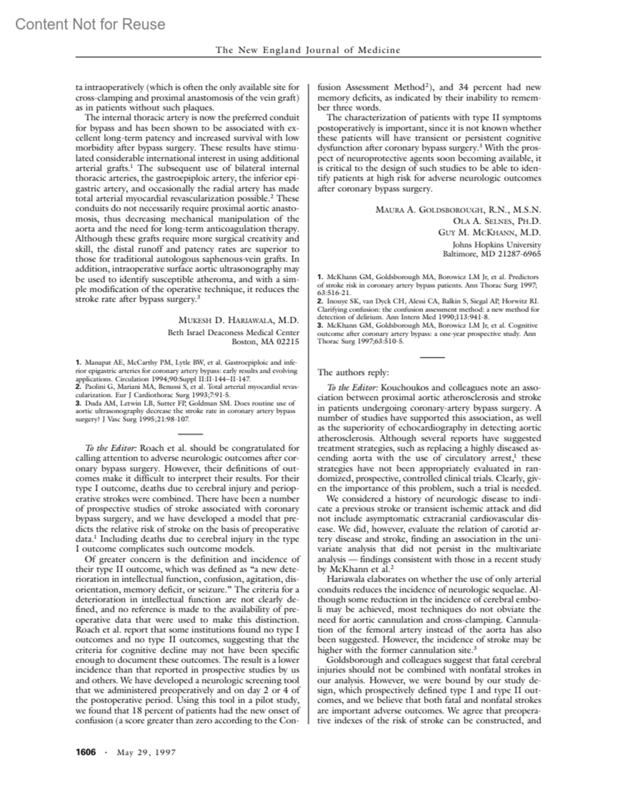 Adverse Cerebral Outcomes after Coronary Bypass SurgeryRoach, Gary W.Mangano, Dennis T.Author informationKaiser Permanente Medical Center; San Francisco, CA 94115 (Roach); Veterans Affairs Medical Center; San Francisco, CA 94121 (Mangano)New England Journal of Medicine 336(22):p 1606-1607, May 29, 1997.Copyright © Owned, published, and © copyrighted, 1997, by the MASSACHUSETTS MEDICAL SOCIETY