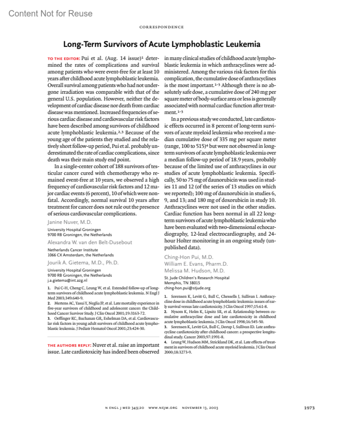 Long-Term Survivors of Acute Lymphoblastic LeukemiaPui, Ching-HonEvans, William E.Hudson, Melissa M.Author informationSt. Jude Children's Research Hospital; Memphis, TN 38015[email protected]New England Journal of Medicine 349(20):p 1973, November 13, 2003.Copyright © 2003 Massachusetts Medical Society. All rights reserved.