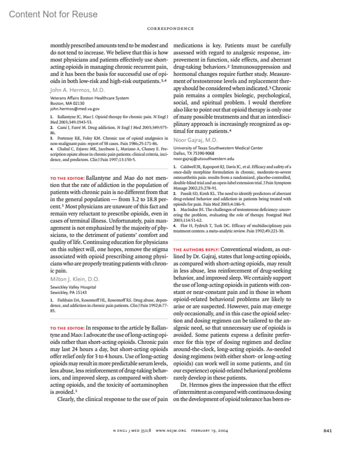 Opioid Therapy for Chronic PainBallantyne, Jane C.Mao, Jianren.Author informationMassachusetts General Hospital; Boston, MA 02114[email protected]New England Journal of Medicine 350(8):p 841-842, February 19, 2004.Copyright © 2004 Massachusetts Medical Society. All rights reserved.