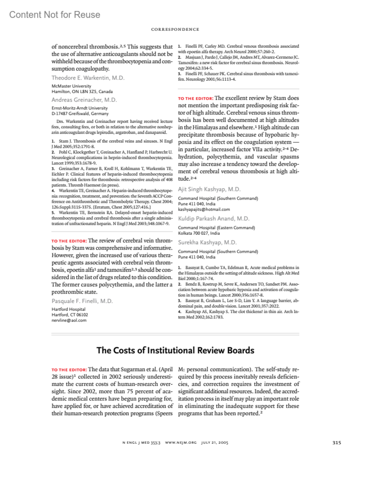 New England Journal of Medicine 353(3):p 315, July 21, 2005.