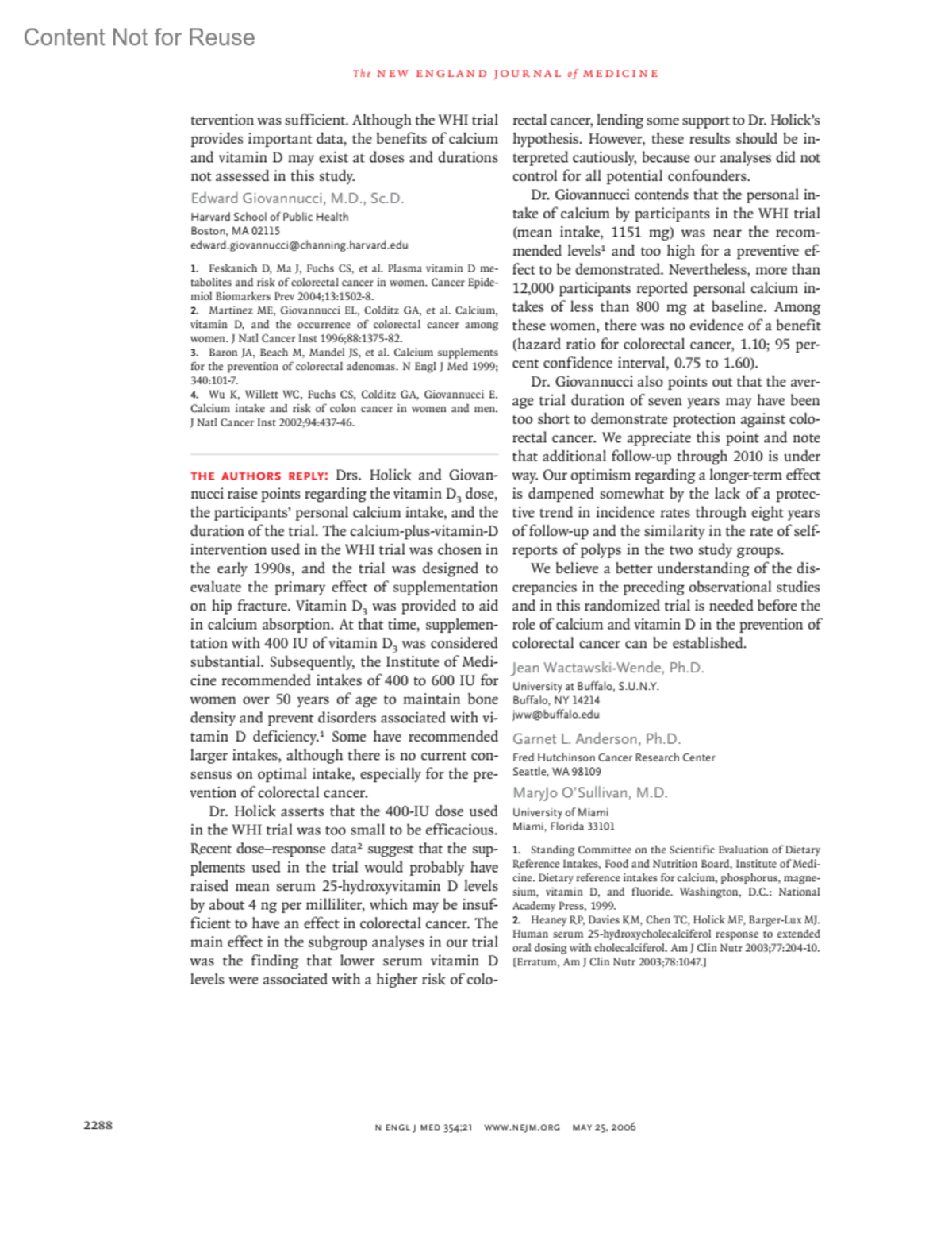 Calcium plus Vitamin D and the Risk of Colorectal CancerWactawski-Wende, JeanAnderson, Garnet L.O'Sullivan, MaryJo.Author informationUniversity at Buffalo, S.U.N.Y., Buffalo, NY 14214 (Wactawski-Wende)[email protected]Fred Hutchinson Cancer Research Center, Seattle, WA 98109 (Anderson)University of Miami, Miami, Florida 33101 (O'Sullivan)New England Journal of Medicine 354(21):p 2288, May 25, 2006.Copyright © 2006 Massachusetts Medical Society. All rights reserved.