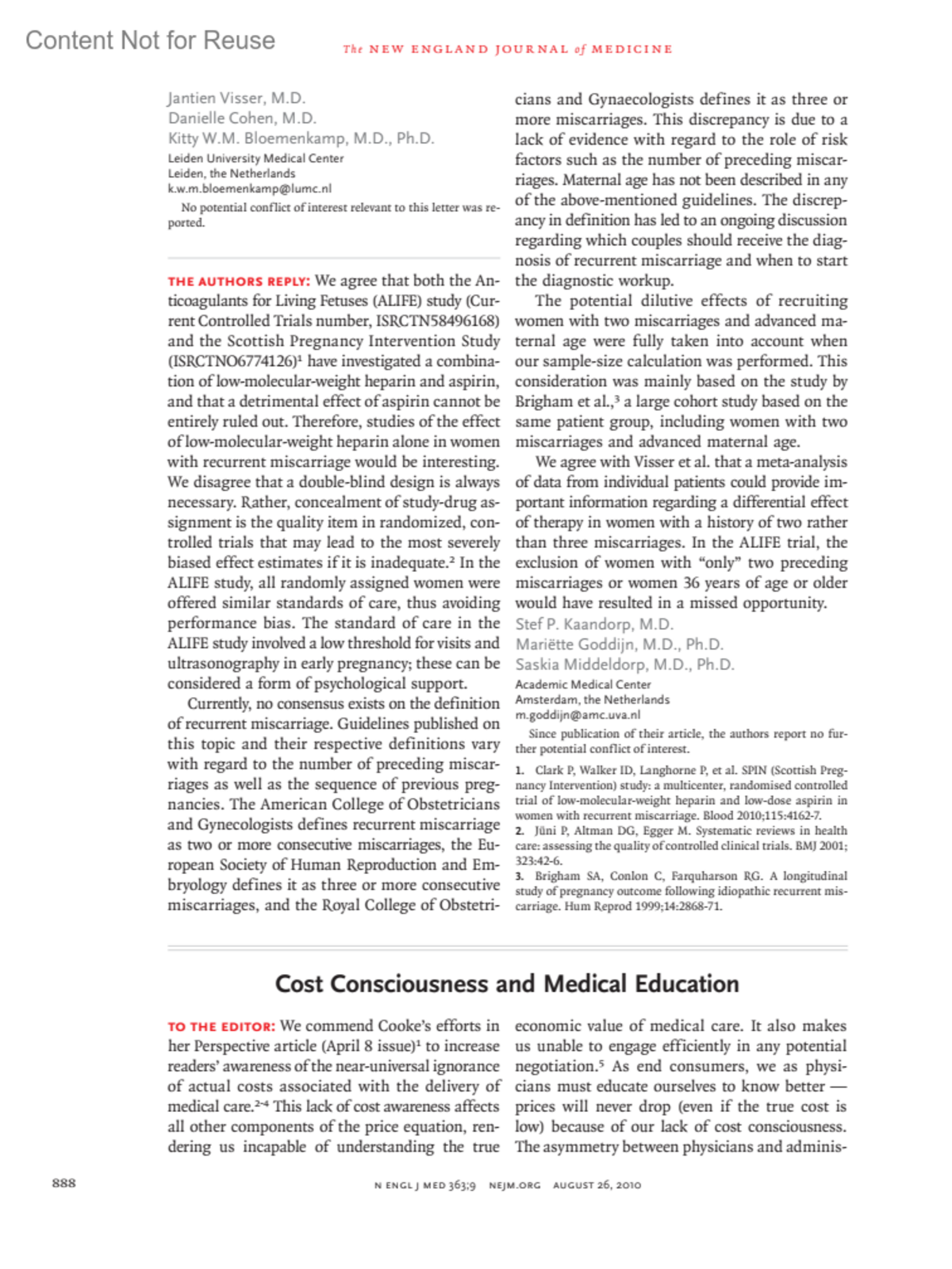 New England Journal of Medicine 363(9):p 888, August 26, 2010.