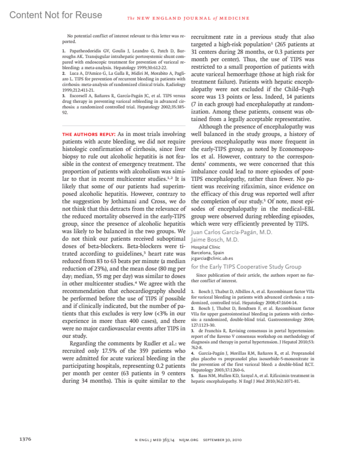 Early Use of TIPS for Cirrhosis and Variceal BleedingGarcía-Pagán, Juan Carlos M.D.Bosch, Jaime M.D.Author informationSince publication of their article, the authors report no further conflict of interest.New England Journal of Medicine 363(14):p 1376, September 30, 2010.Copyright © 2010 Massachusetts Medical Society. All rights reserved.