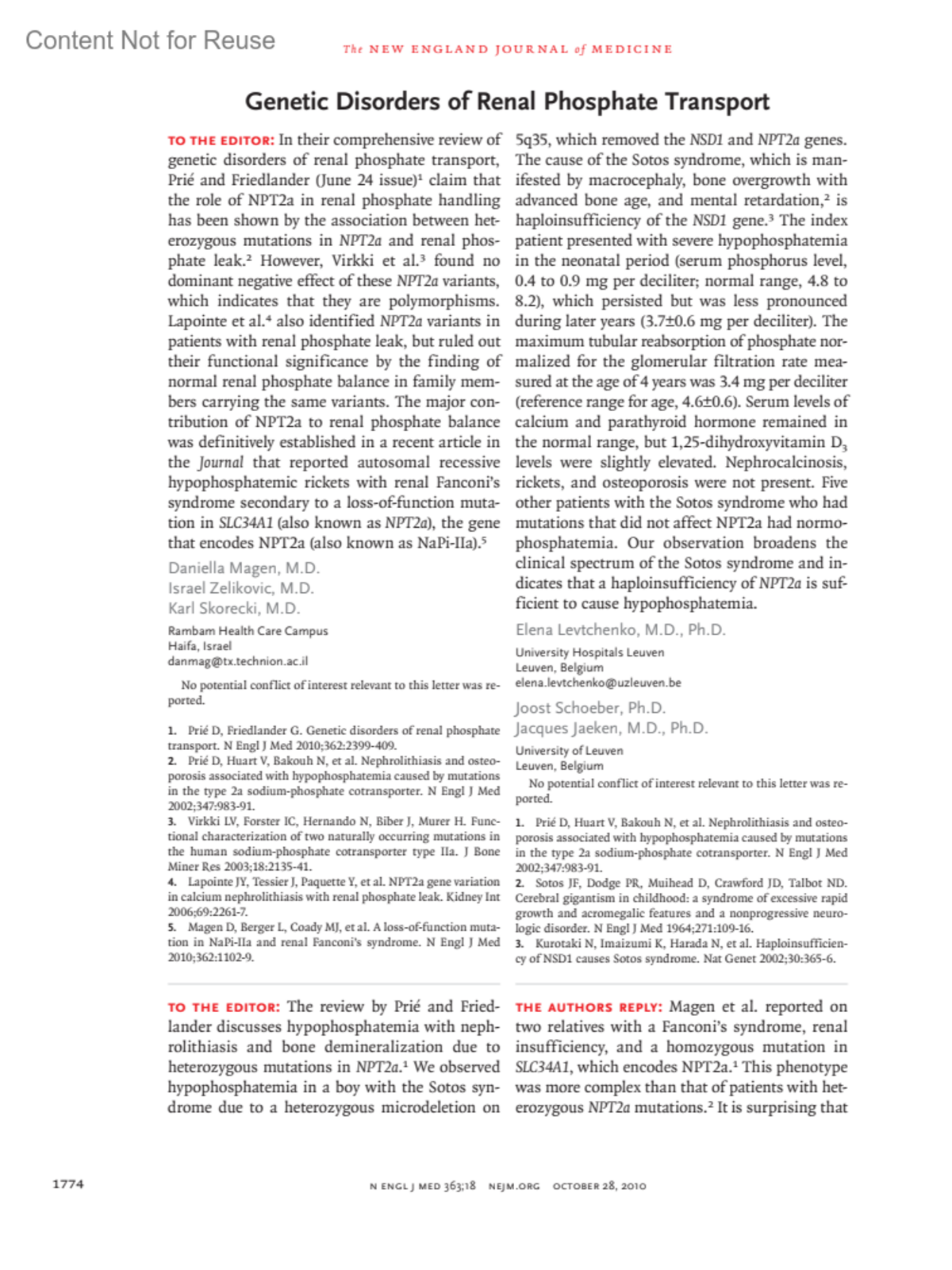 Genetic Disorders of Renal Phosphate TransportFriedlander, Gérard M.D., Ph.D.Prié, Dominique M.D., Ph.D.Author informationSince publication of their article, the authors report no further potential conflict of interest.New England Journal of Medicine 363(18):p 1774-1775, October 28, 2010.Copyright © 2010 Massachusetts Medical Society. All rights reserved.