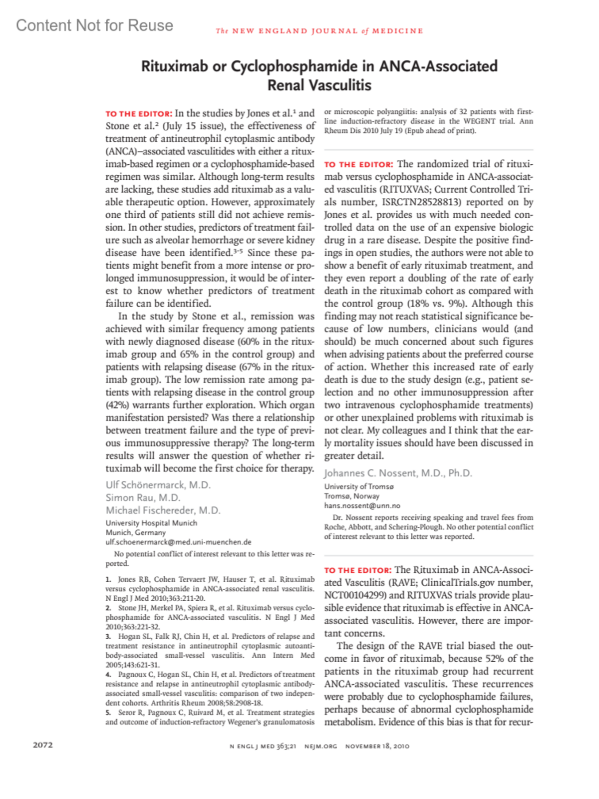 Rituximab or Cyclophosphamide in ANCA-Associated Renal VasculitisStone, John H. M.D., M.P.H.Specks, Ulrich M.D.Author informationSince publication of their article, the authors report no further potential conflict of interest.New England Journal of Medicine 363(21):p 2074, November 18, 2010.Copyright © 2010 Massachusetts Medical Society. All rights reserved.