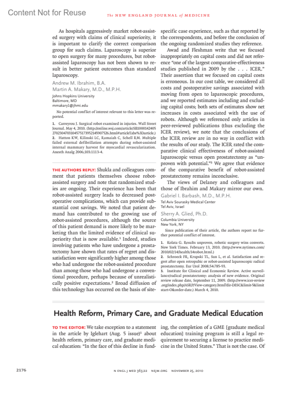 Robot-Assisted Surgery and Health Care CostsBarbash, Gabriel I. M.D., M.P.H.Glied, Sherry A. Ph.D.Author informationSince publication of their article, the authors report no further potential conflict of interest.New England Journal of Medicine 363(22):p 2176, November 25, 2010.Copyright © 2010 Massachusetts Medical Society. All rights reserved.