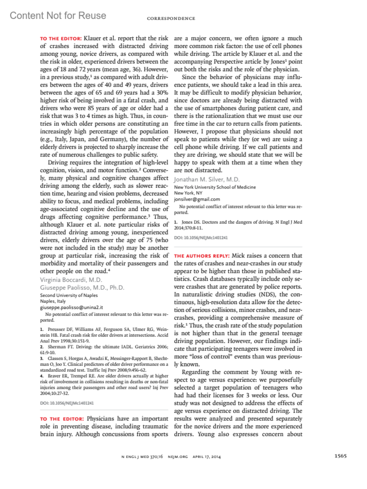 Since publication of their article, Dr. Klauer's disclosure form has been updated to include grant support from the automotive industry and Dr. Guo's disclosure form has been updated to include grant support from an accident-management company. The disclosure forms of Drs. Lee and Dingus, coauthors, have also been updated to include grant support from the automotive industry. No further potential conflict of interest relevant to this letter was reported.