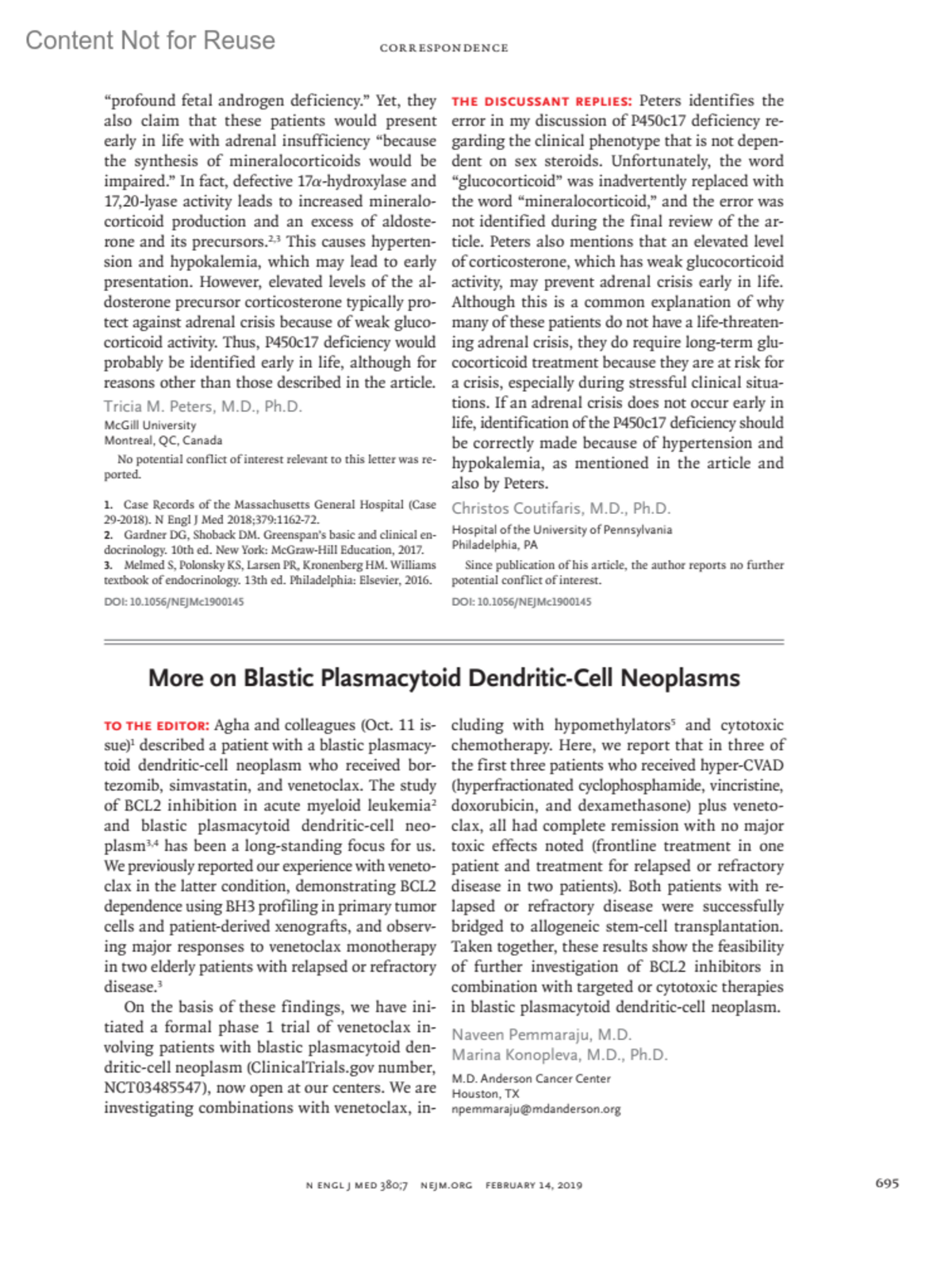 Dr. Pemmaraju reports receiving research funding or clinical trial support from Stemline Therapeutics, Novartis, Samus Therapeutics, AbbVie, Cellectis, Plexxikon, Daiichi Sankyo, and Affymetrix and consulting fees from Novartis, Incyte, LFB, and Celgene; Dr. Konopleva, receiving research funding from AbbVie, Genentech, Eli Lilly, Cellectis, Calithera Biosciences, Stemline Therapeutics, Threshold Pharmaceuticals, Flexus Biosciences, Novartis, Ablynx, and Agios Pharmaceuticals, consulting fees and honoraria from AbbVie, Genentech, and F. Hoffmann–La Roche, and advisory board fees from F. Hoffmann–La Roche and owning stock in Reata Pharmaceuticals; and Dr. Lane, receiving research funding from Stemline Therapeutics and AbbVie and consulting fees from N-of-One. No other potential conflict of interest relevant to this letter was reported.