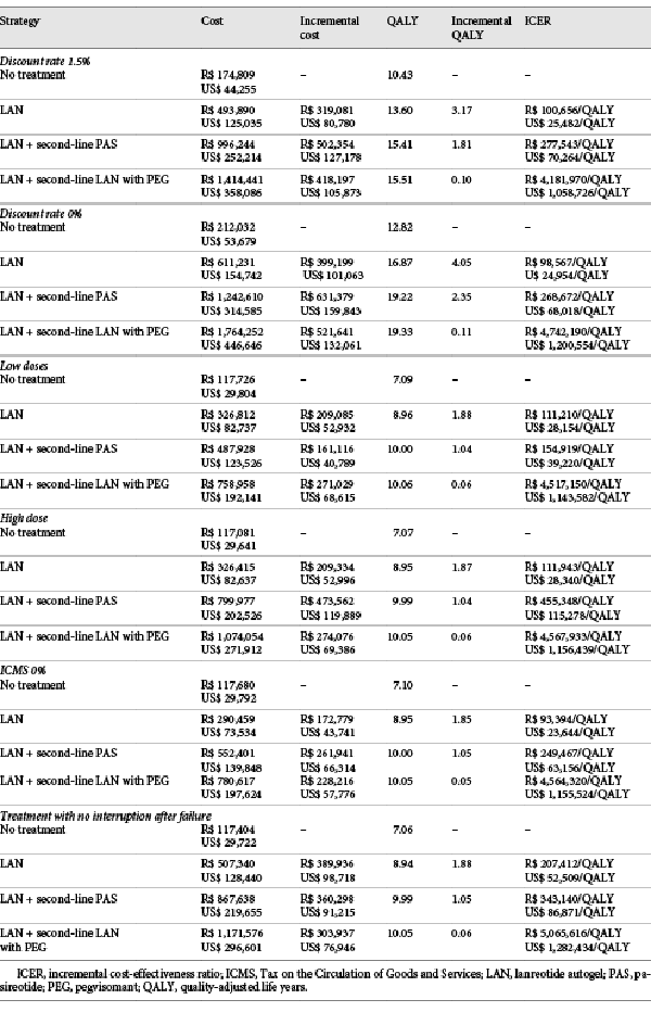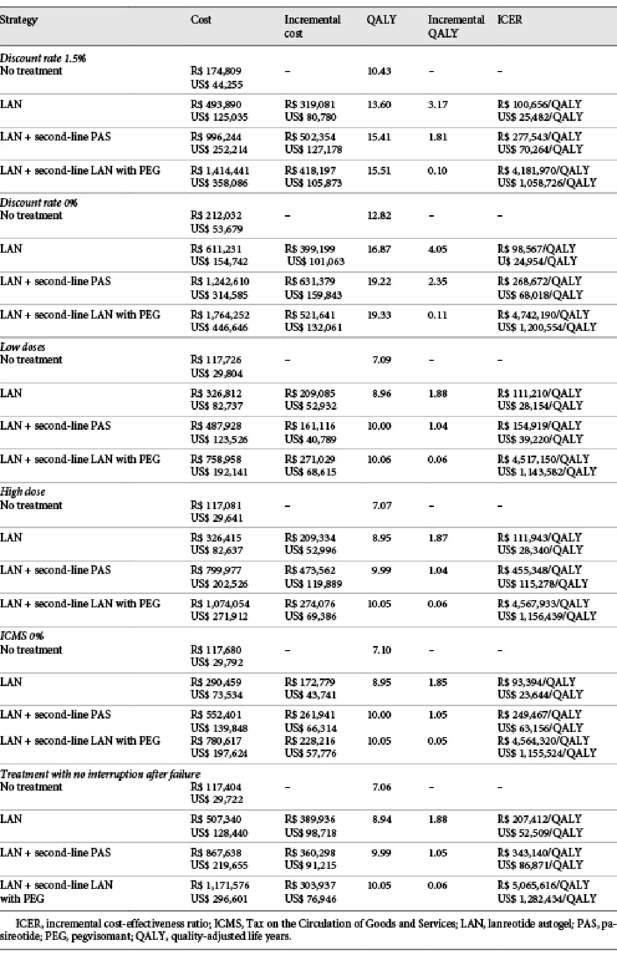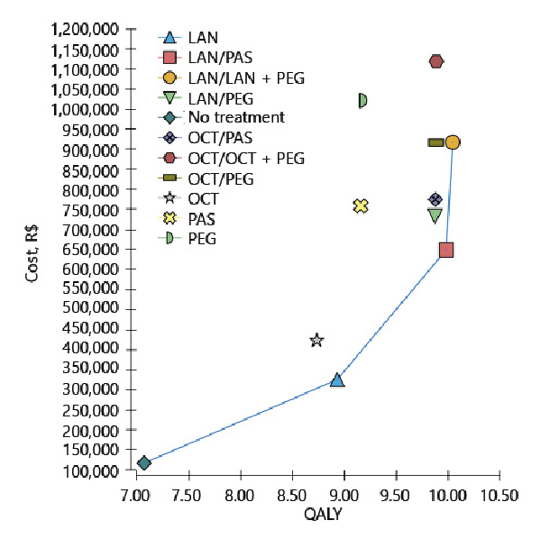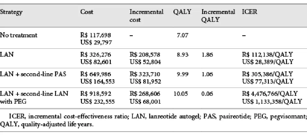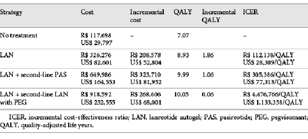 Eleven strategies were compared. The one with the lowest clinical effect was no treatment, with a QALY of 7.07, followed by octreotide LAR (8.74) and by lanreotide autogel (8.93). The strategies with the highest QALY values were lanreotide autogel + second-line lanreotide autogel with pegvisomant (10.05), and lanreotide autogel + second-line pasireotide (9.99). The less expensive strategy was no treatment, with a mean cost of R$ 117,698/US$ 29,797, followed by lanreotide autogel (R$ 326,276/US$ 82,601) and by octreotide LAR (R$ 423,707/US$ 107,267). The most expensive ones were octreotide + second-line octreotide with pegvisomant (R$ 1,120,628/US$ 283,703) and pegvisomant (R$ 1,023,381/US$ 259,084).