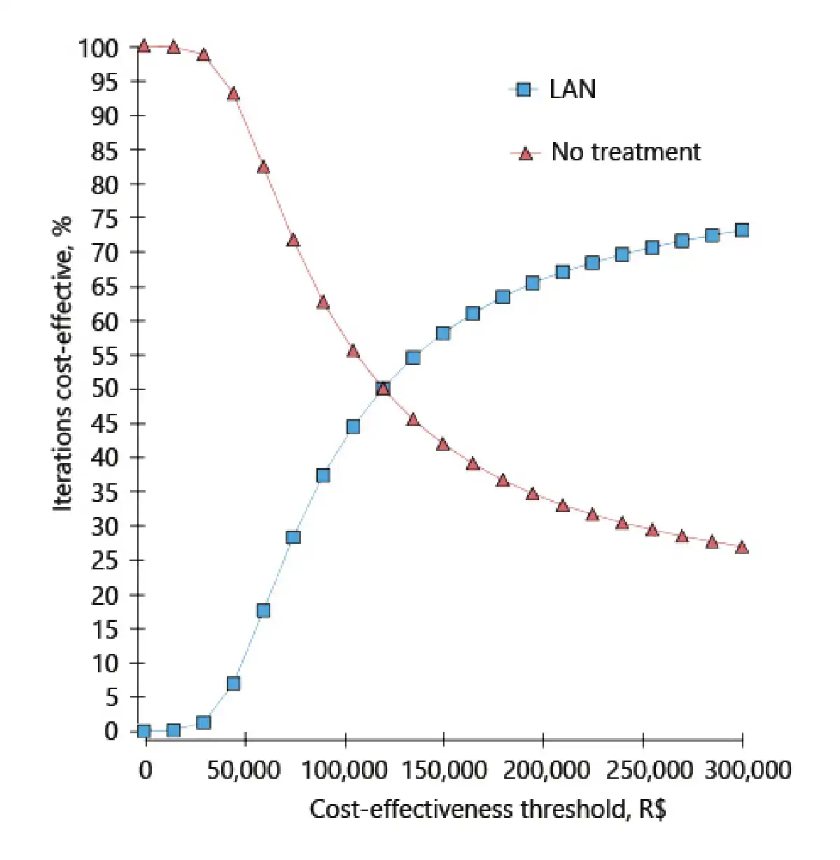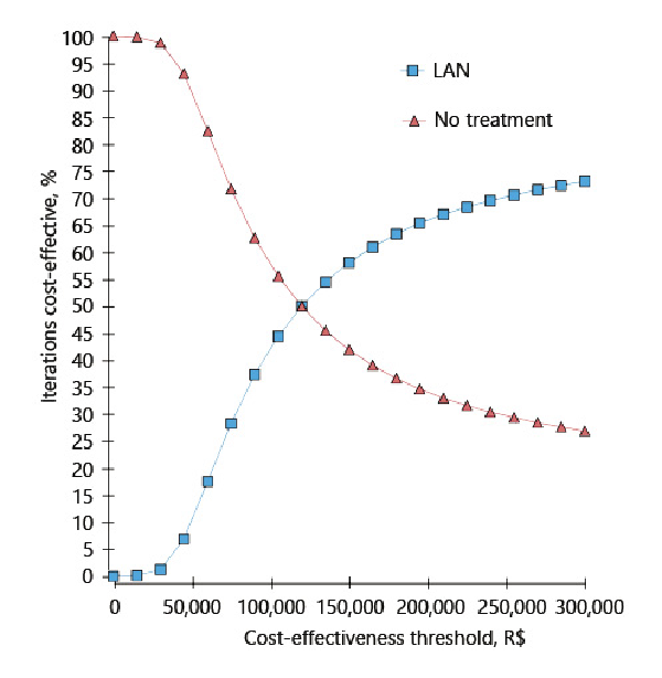 The only strategy that shows potential to be considered cost-effective is lanreotide autogel (ICER compared to no treatment of R$ 112,138/US$ 28,389 per QALY). The probability of it being the most cost-effective option compared to no treatment is shown in Figure 3 for different cost-effectiveness thresholds. When considering three times Brazil’s GDP per capita (R$ 91,645/US$ 23,201) as the cost threshold value [], lanreotide autogel was the most cost-effective strategy 38.19% of the time compared to no treatment.