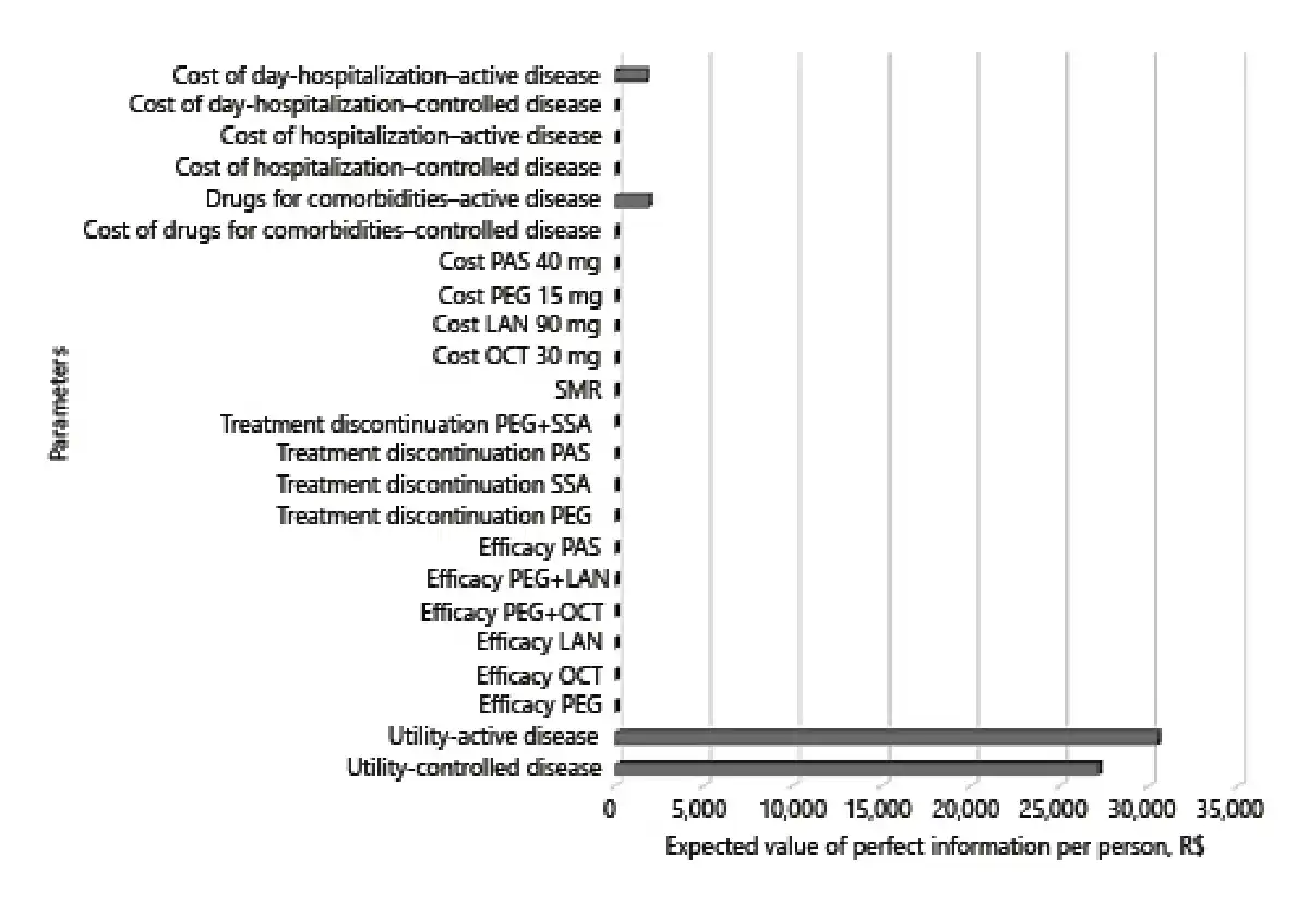 As can be seen in Figure 4, the individual parameters in which uncertainty affects the decision the most are, by far, the utility of active and controlled disease (R$ 30,466/US$ 7,713 and R$ 27,163/US$ 6,877 per person, respectively). This means that future research to reduce decision uncertainty should be focused on quality of life studies.