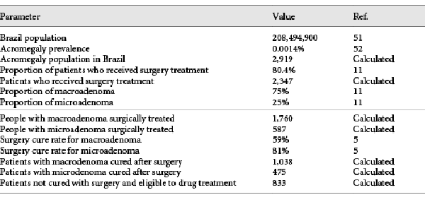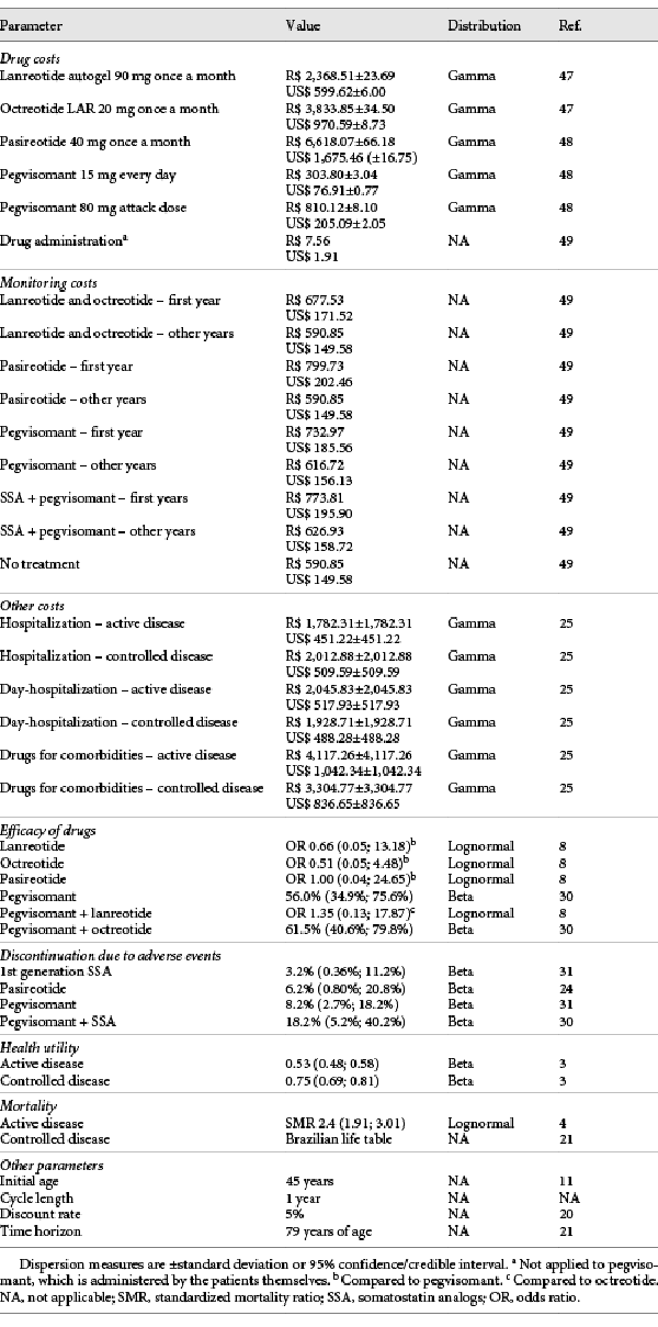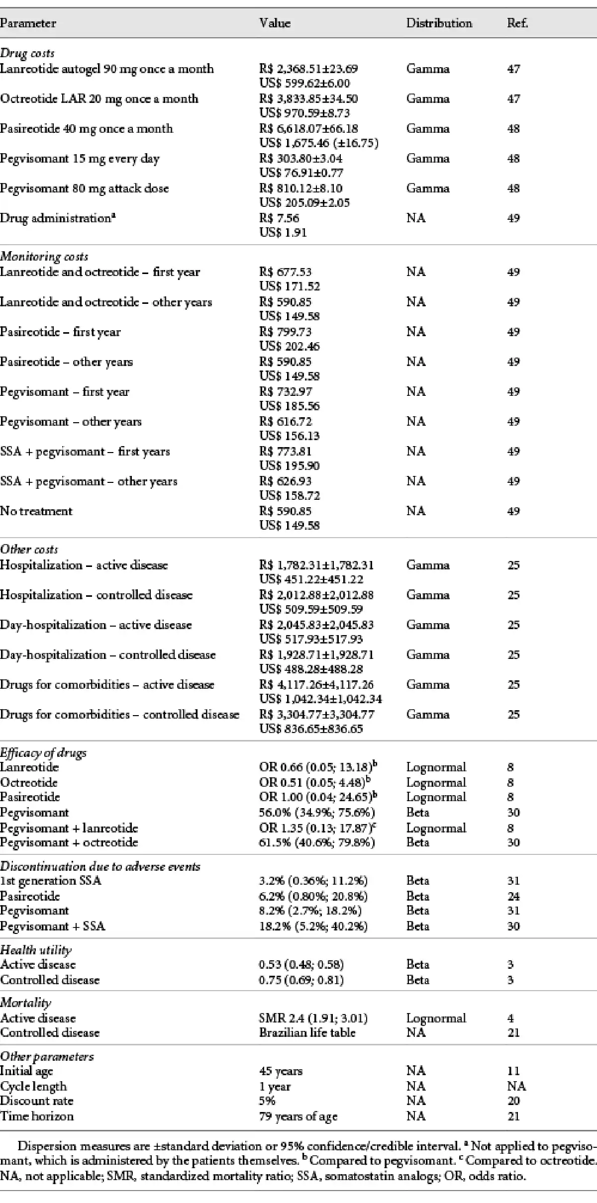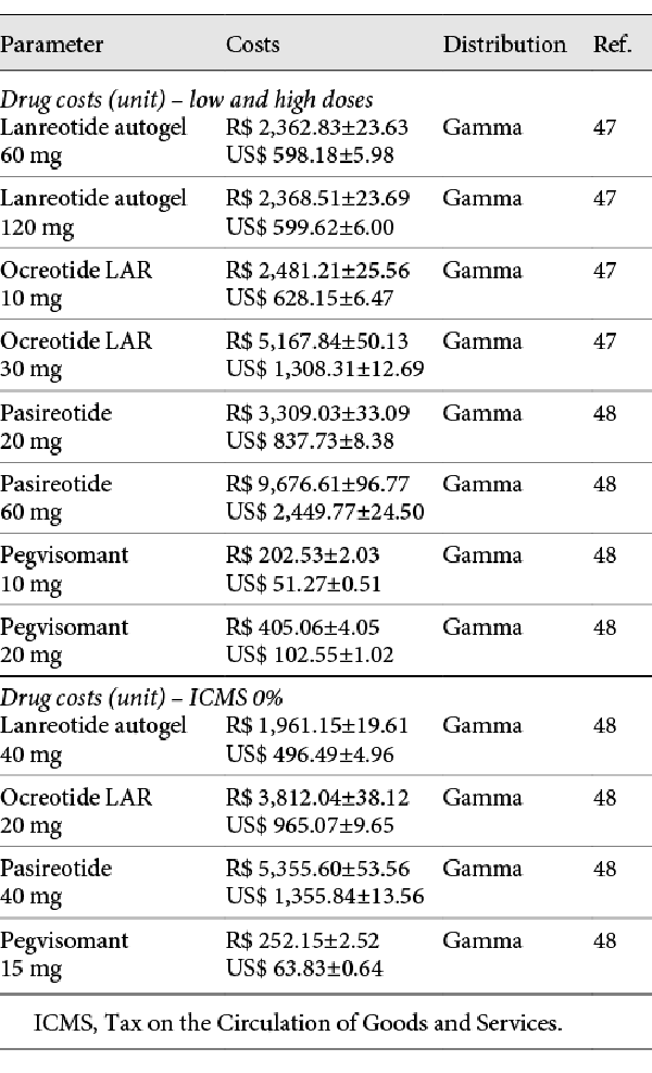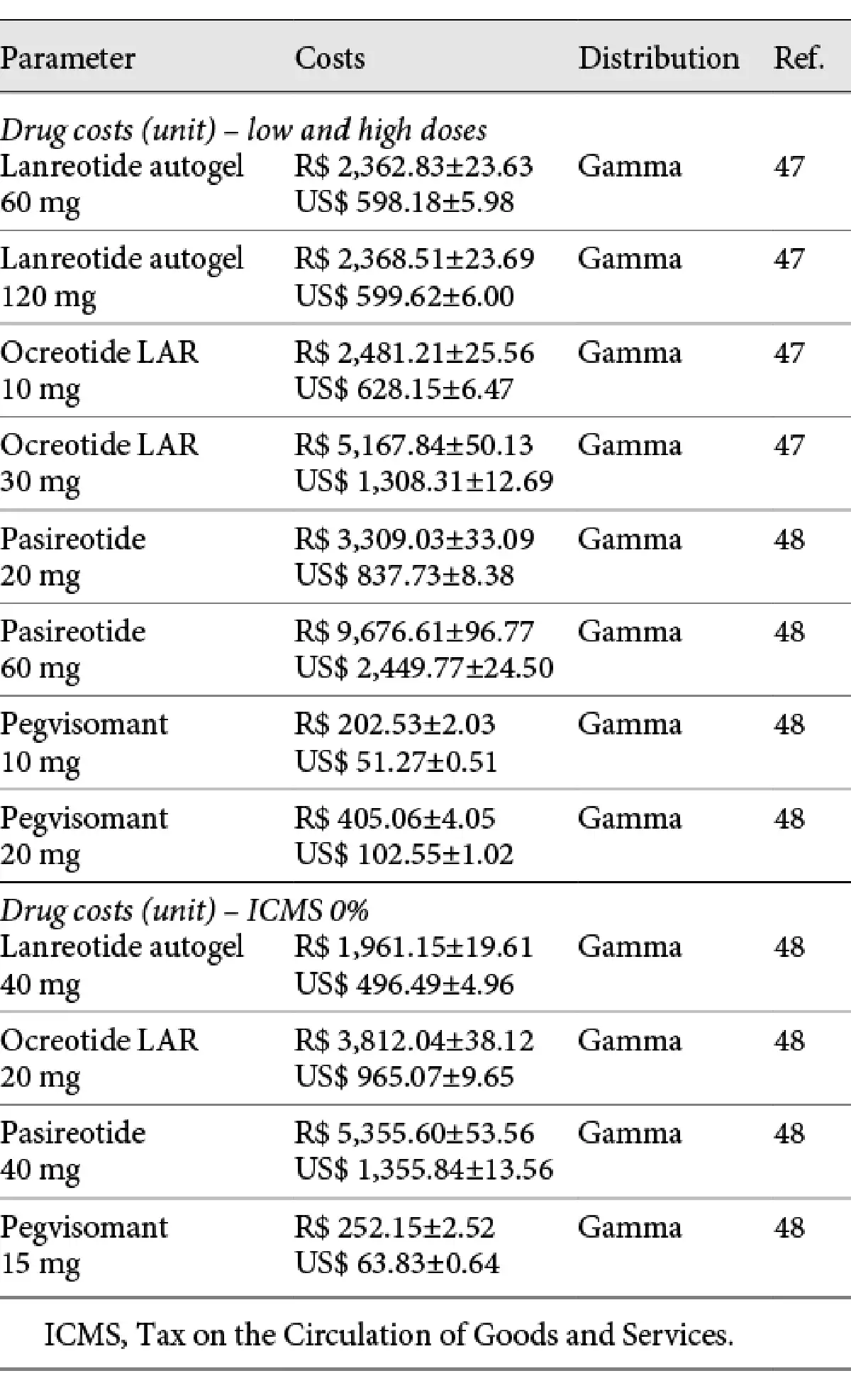 Other costs associated with acromegaly, such as drugs for comorbidities and costs of hospitalization and day-hospitalization were retrieved from a burden of disease study []. The costs were divided into those for patients with controlled disease and with uncontrolled disease. As the study was conducted in Italy some years ago, the costs were corrected for Italian monetary inflation using the consumer price index and converted to R$ according to the purchasing power parities [, ]. Since the primary study did not show a dispersion measure, we considered the value of the standard deviation to be the same as the mean []. All costs considered in the analyses are shown in Table 1. The costs throughout this article are shown in Brazilian Reais (R$) and in American Dollars (US$) for the year 2019. US$ 1.00 equals R$ 3.95 (average conversion rate in 2019) [].