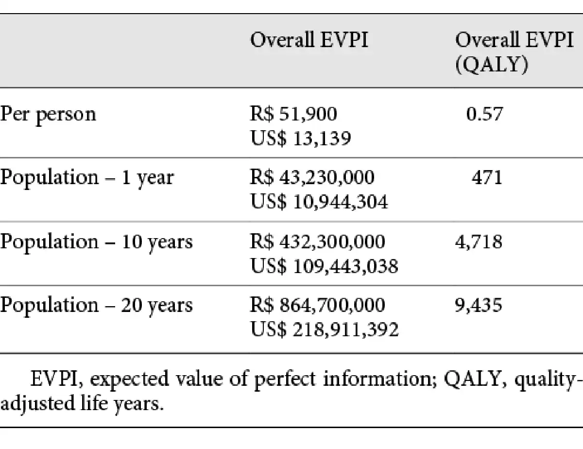 In our study, the VOI analysis enabled the estimation of uncertainty. Through the EVPI analysis, it is possible to appraise how much money is lost if the decision is made in an environment of high uncertainty. Therefore, the population EVPI shows how much should be spent on future research to eliminate uncertainty. Our results demonstrated that a maximum amount per year of R$ 43,230,000/US$ 10,944,304 should be considered. Thus, it is safe to say that the performance of new clinical studies is mandatory to eliminate the uncertainty surrounding the parameters before definitive conclusions concerning the cost-effectiveness of the therapies are made.