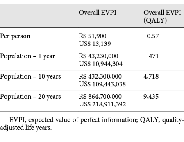 The overall EVPI per person was estimated at R$ 51,900/US$ 13,139, which is equivalent to 0.57 QALYs per person. The overall population EVPI was estimated at R$ 43,230,000/US$ 10,944,304 per year. This is the expected cost of uncertainty surrounding the model and the maximum value that future research should cost to eliminate all relevant decision uncertainty. When considering other decision relevance horizons, the population EVPI is even higher (Table 7).